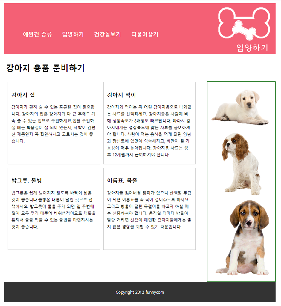 <p>강아지가 편히 쉴 수 있는 포근한 집이 필요합니다. 강아지의 집은 강아지가 다 큰 후에도 계속 쓸 수 있는 집으로 구입하세요.집을 구입하실 때는 박음질이 잘 되어 있는지, 세탁이 간편한 제품인지 꼭 확인하시고 고르시는 것이 좋습니다.</p>