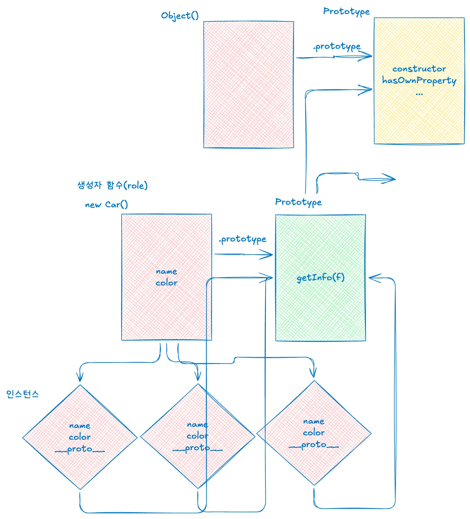 this로 정의된 인스턴스 고유 속성this.name = name;으로 설정된 속성은 각 인스턴스의 멤버 속성__proto__ 속성으로 부모 프로토타입 객체 접근주의: 생성자 함수 내