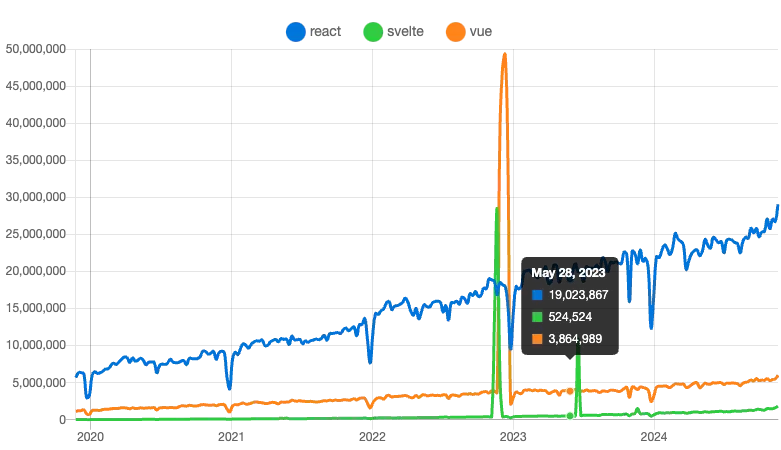 npm 트렌드 사이트 확인 결과 리액트가 Vue, Svelte 등 다른 프레임워크보다 훨씬 많은 사용자 기반 보유 중