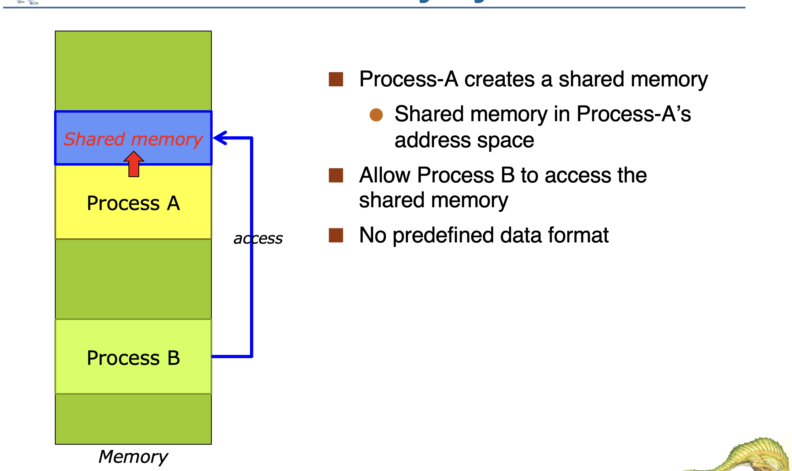 sprintf(data, "Hello from PID %d", getpid()); // 데이터 쓰기| Message Passing | Shared Memory | |