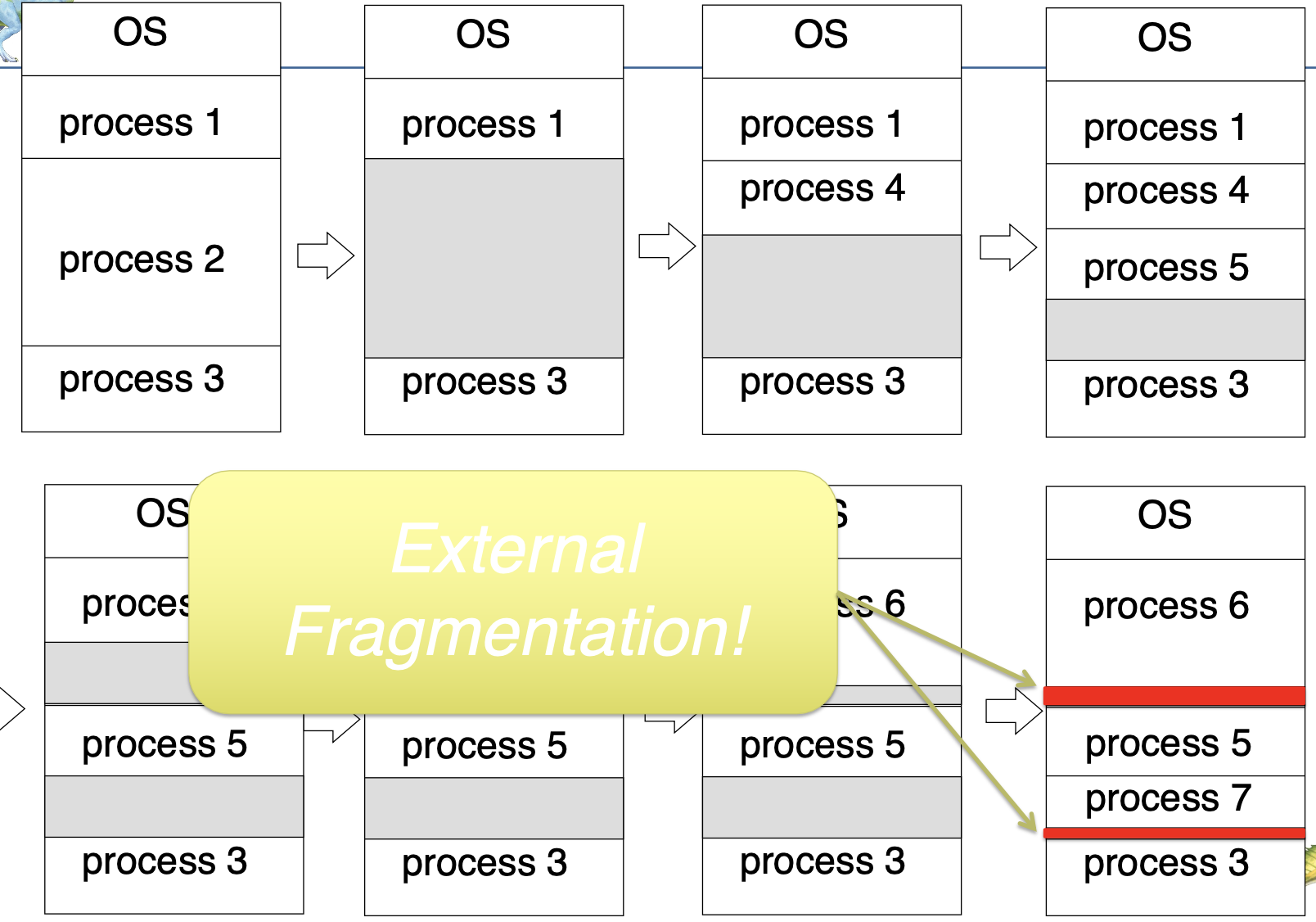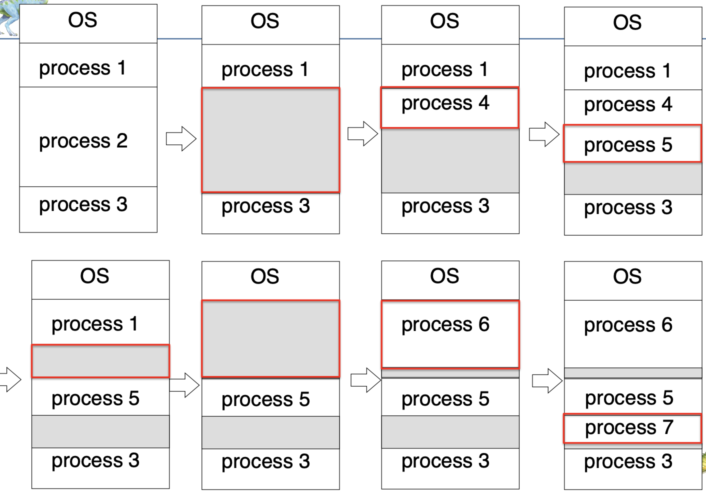 - 전체 빈 공간의 합은 충분해도, 연속된 공간이 부족해 새로운 프로세스가 적재되지 못하는 문제점이 생긴다.
