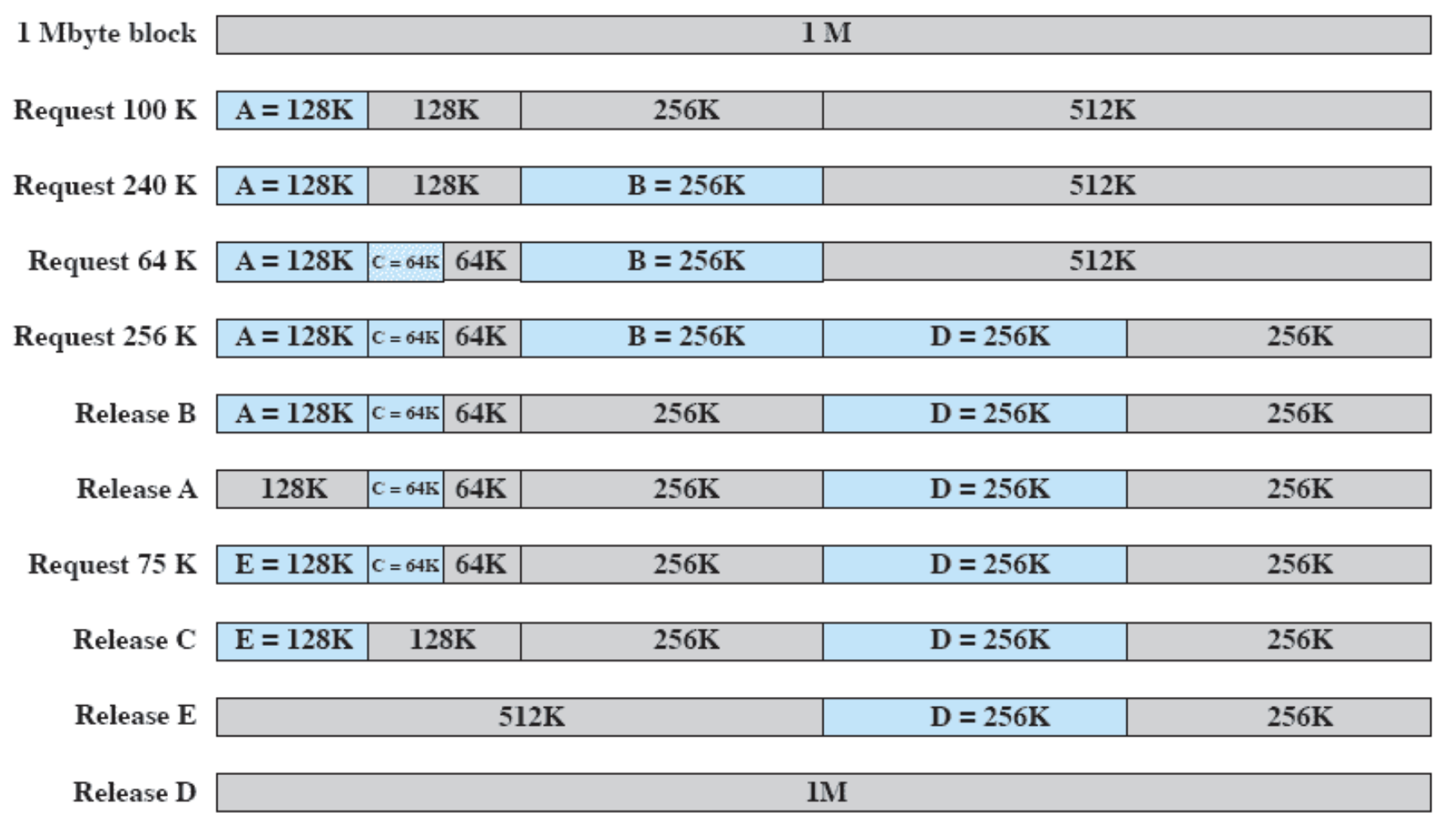 - 전체 메모리 공간(예:1MB)를 시작으로, 요청된 크기 이상이면서 가장 작은 2의 거듭제곱 크기의 블록을 찾아 할당한다.