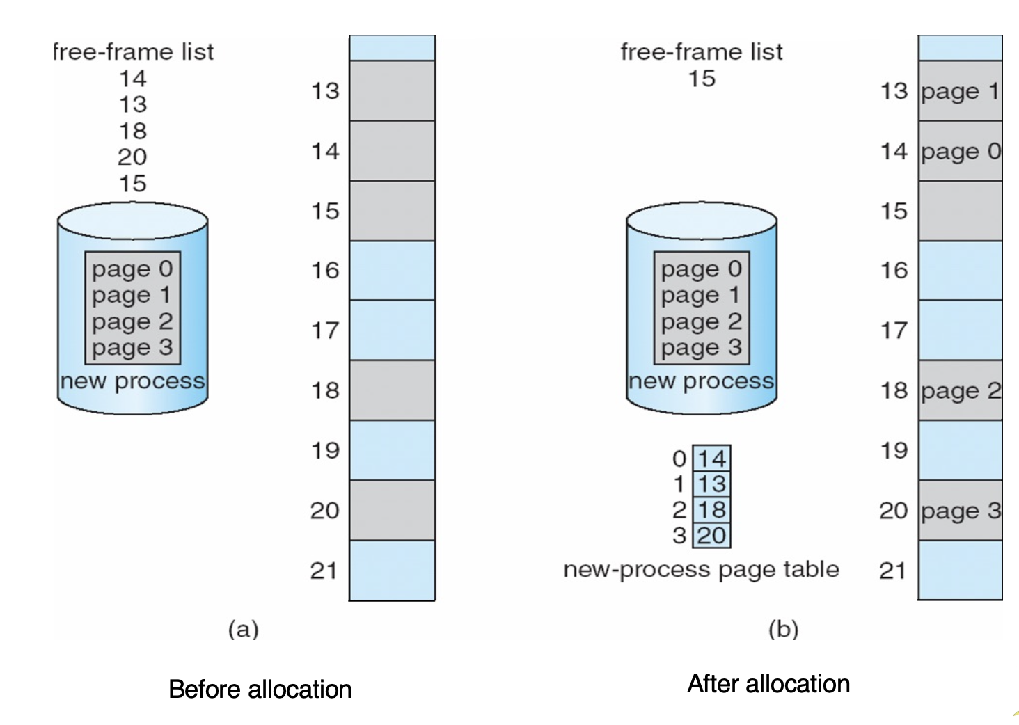 - 만약 free frame이 없다면 안쓰는 frame을 디스크로 보내는 작업을 수행해야 한다. (Page Replacement)