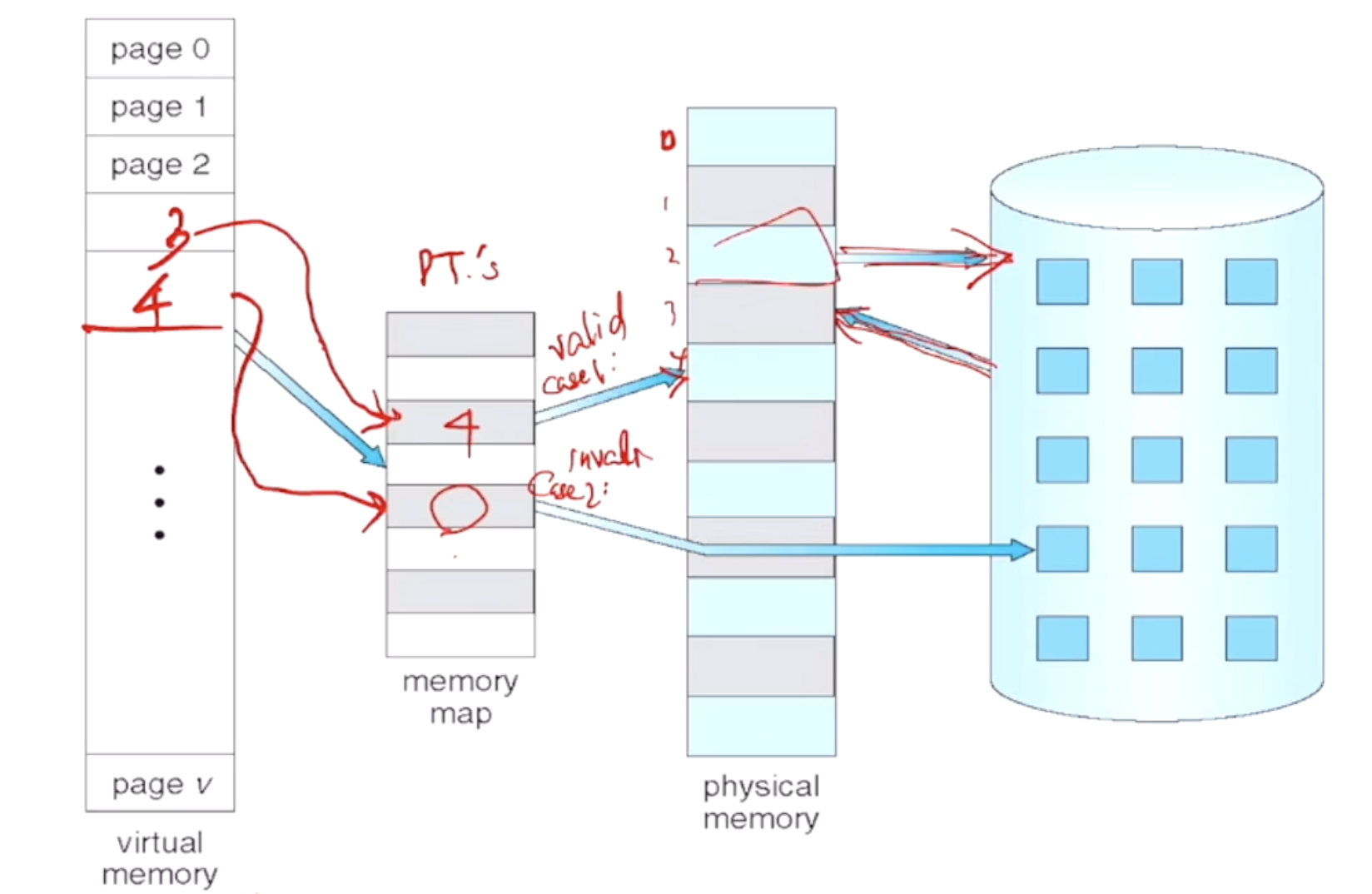 - 그림과 같이 virtual 메모리에서 바로 물리 메모리의 주소를 얻을 수 있는 경우, cash-hit과 마찬가지로 valid를 표시하고, 메모리에 없고 디스크에 존재한다면, Invalid로 표시를 하는 것이다.(page fault)