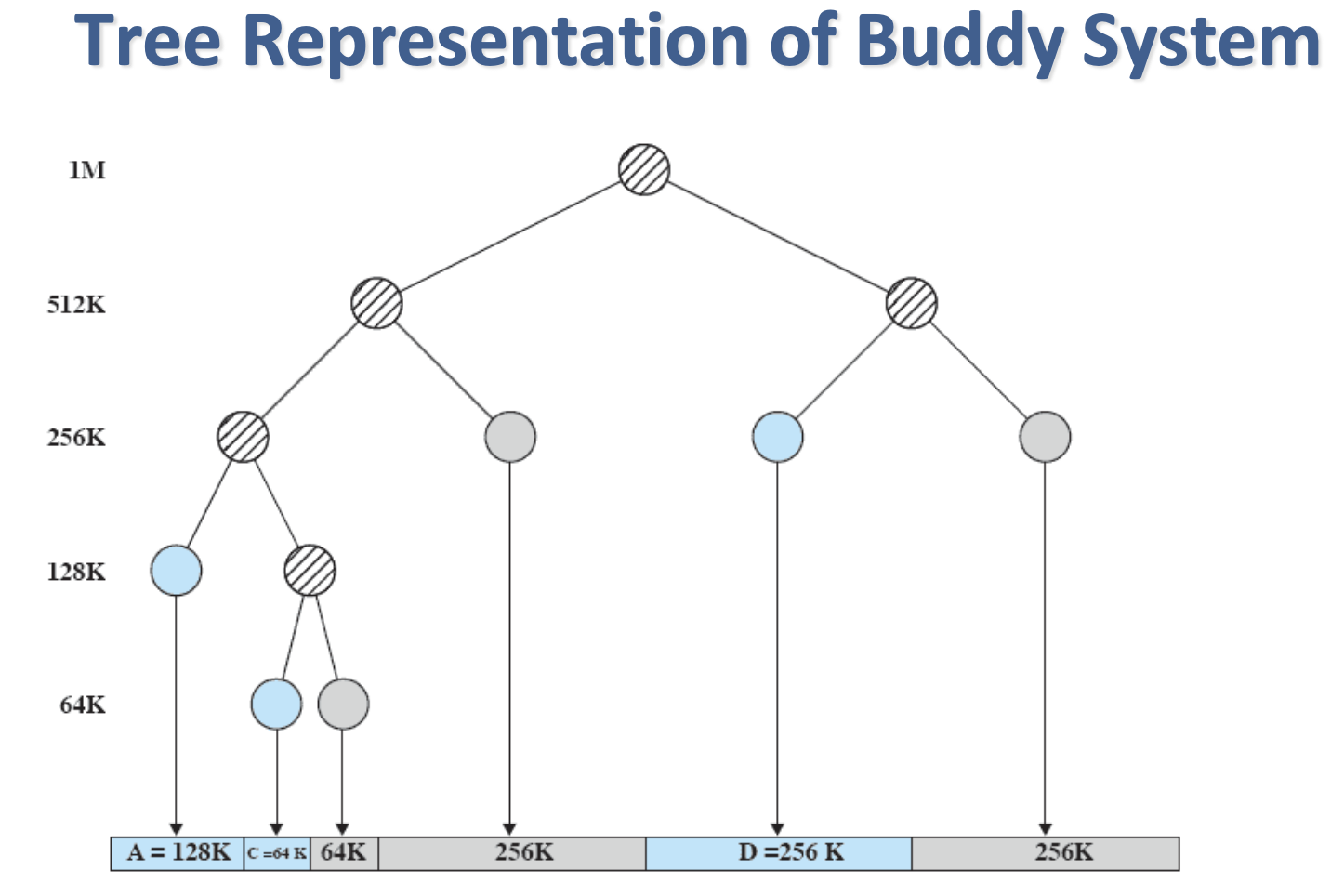 - 프로세스 메모리를 반납하면, 해당 블록의 버디가 비워져있을 경우 두 블록을 다시 합쳐서 더 큰 블록을 만든다.