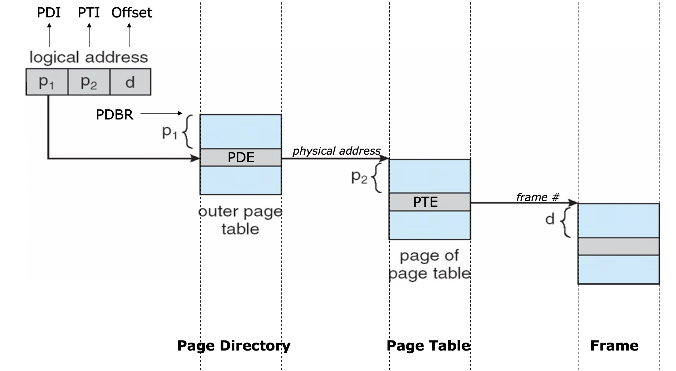 - 저장 위치: 각 페이지 테이블은 정확히 1개의 물리 프레임에 딱 맞게 저장됨.