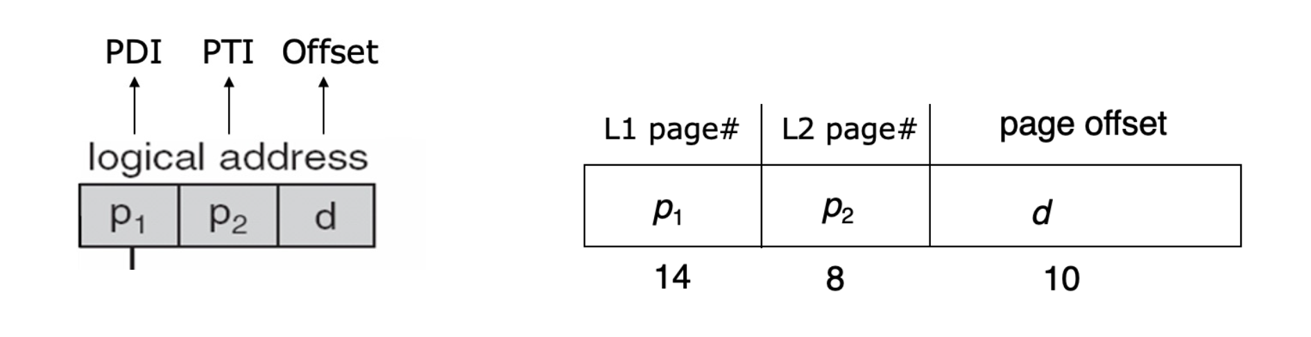 - 전체 주소 공간은 32비트 이기 때문에 32 - 10 (오프셋) - 8(PTI) = 14비트 남음.
