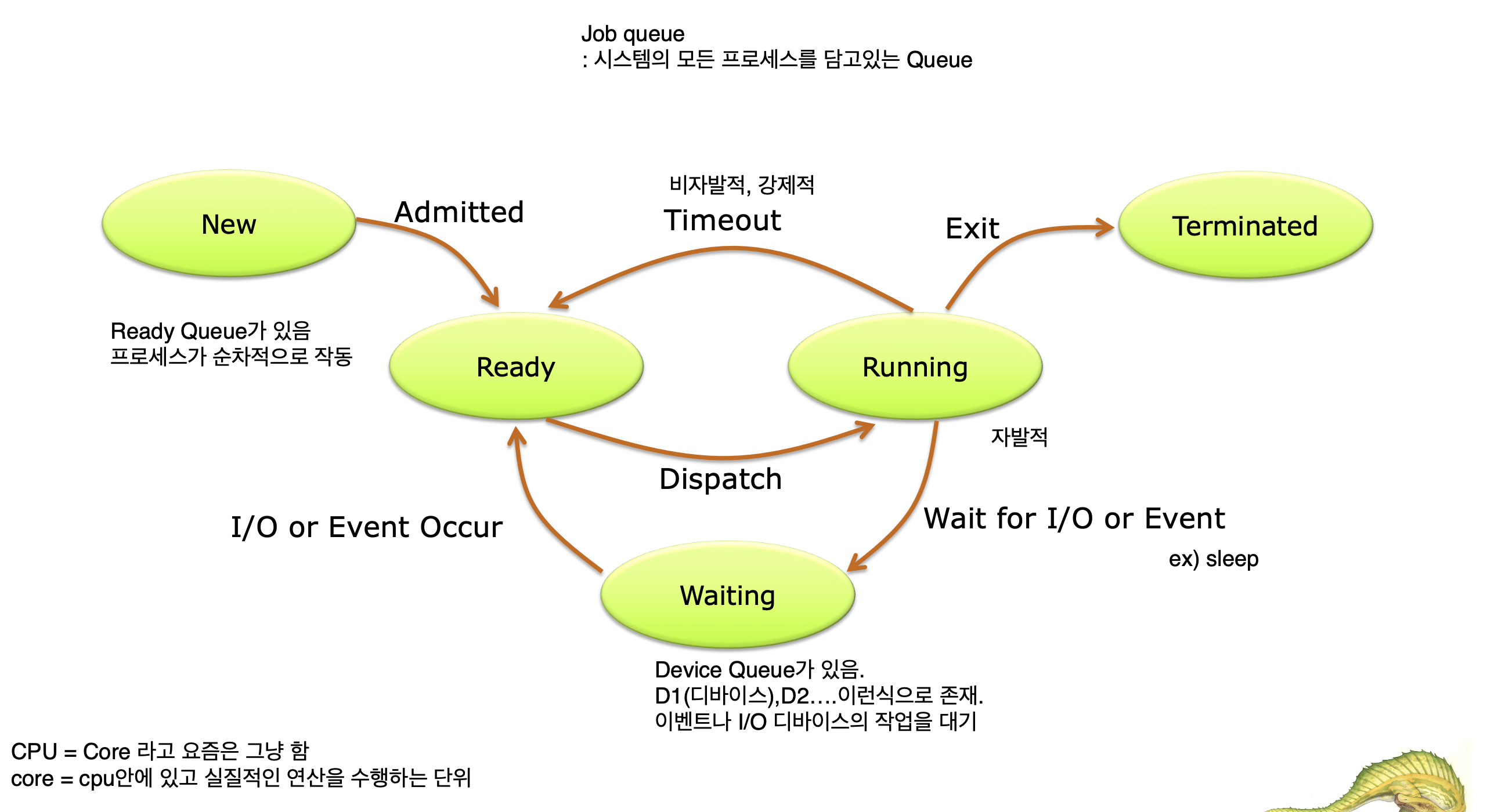 Waiting (or Blocked): I/O 작업 완료 등 이벤트를 기다리는 상태.
