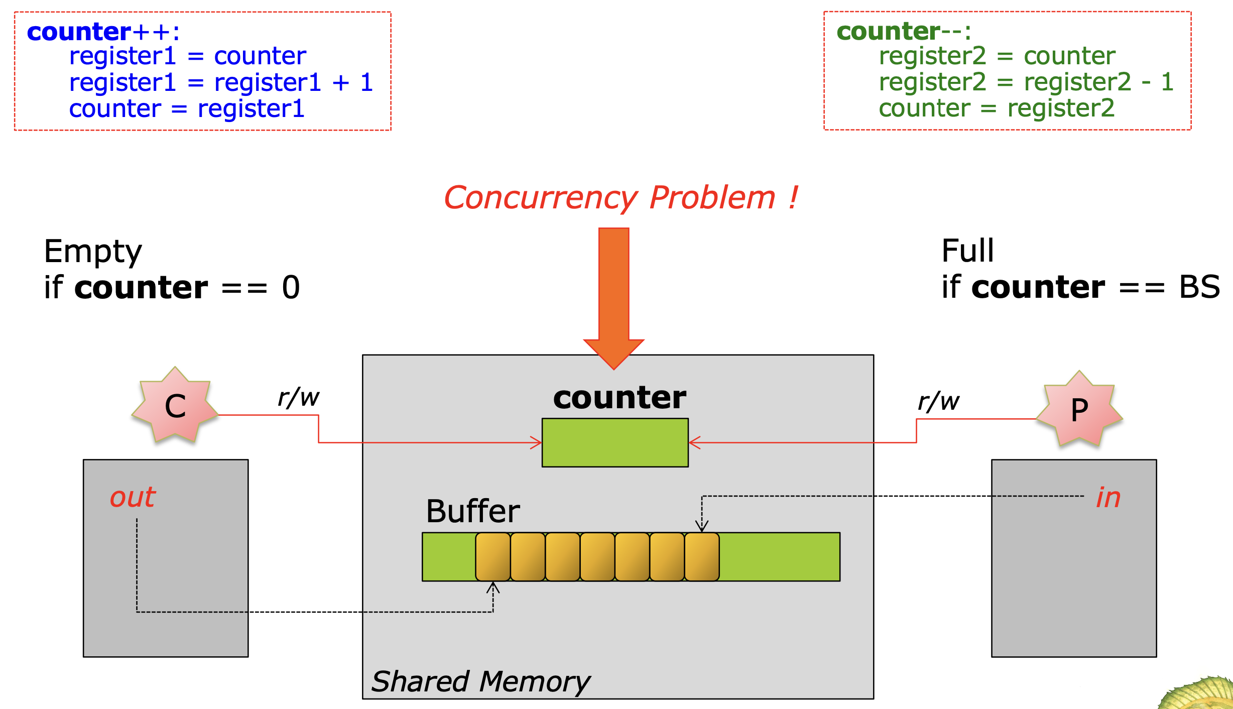 하지만 counter을 생산자와 소비자가 둘 다 실행하면 문제가 발생할 수 있다.