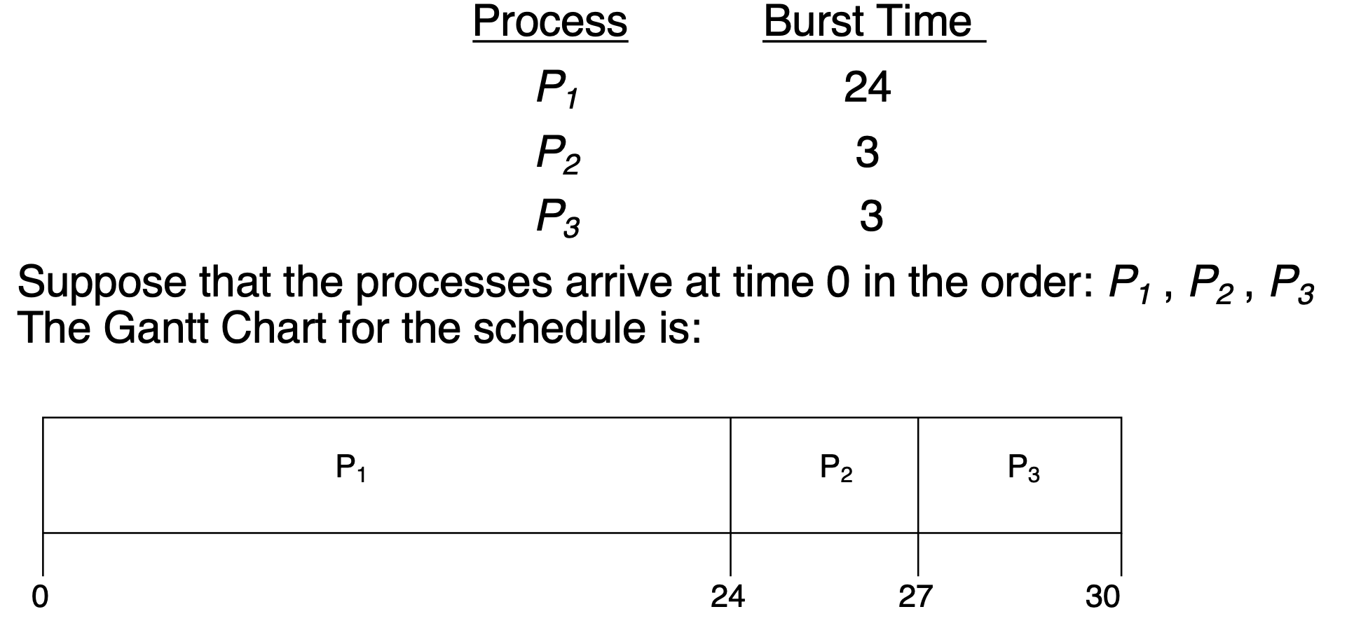 먼저 도착한 프로세스가 먼저 동작하고, 다 끝나면 그 후에 도착한 프로세스가 순차적으로 CPU를 점유하는 방식이다.