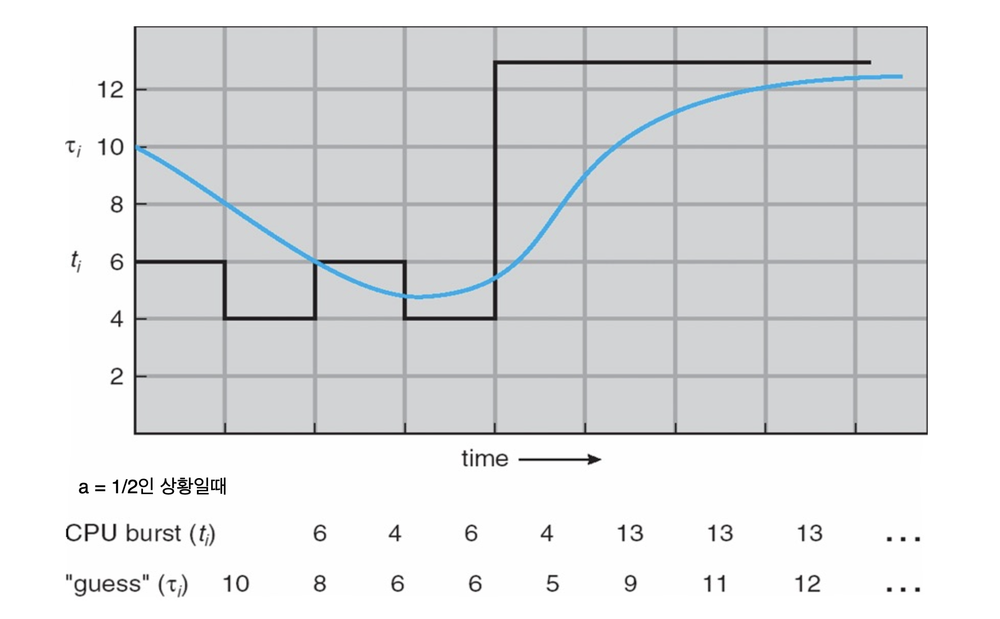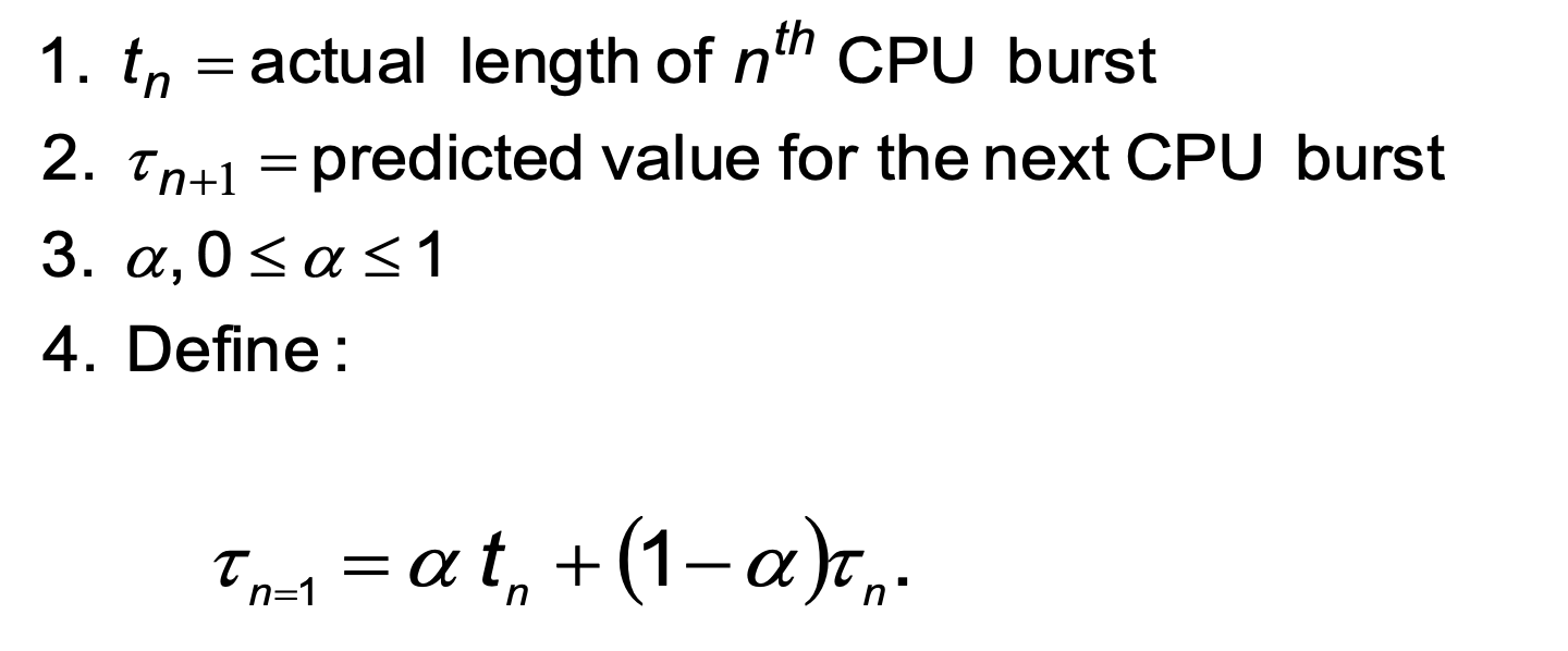 🤨 그렇다면 CPU Burst Time을 어떻게 예측할 수 있을까. 많은 방법이 있겠지만, 이전 결과를 이용해 가중치로 예측을 하는 것이 일반적이다.