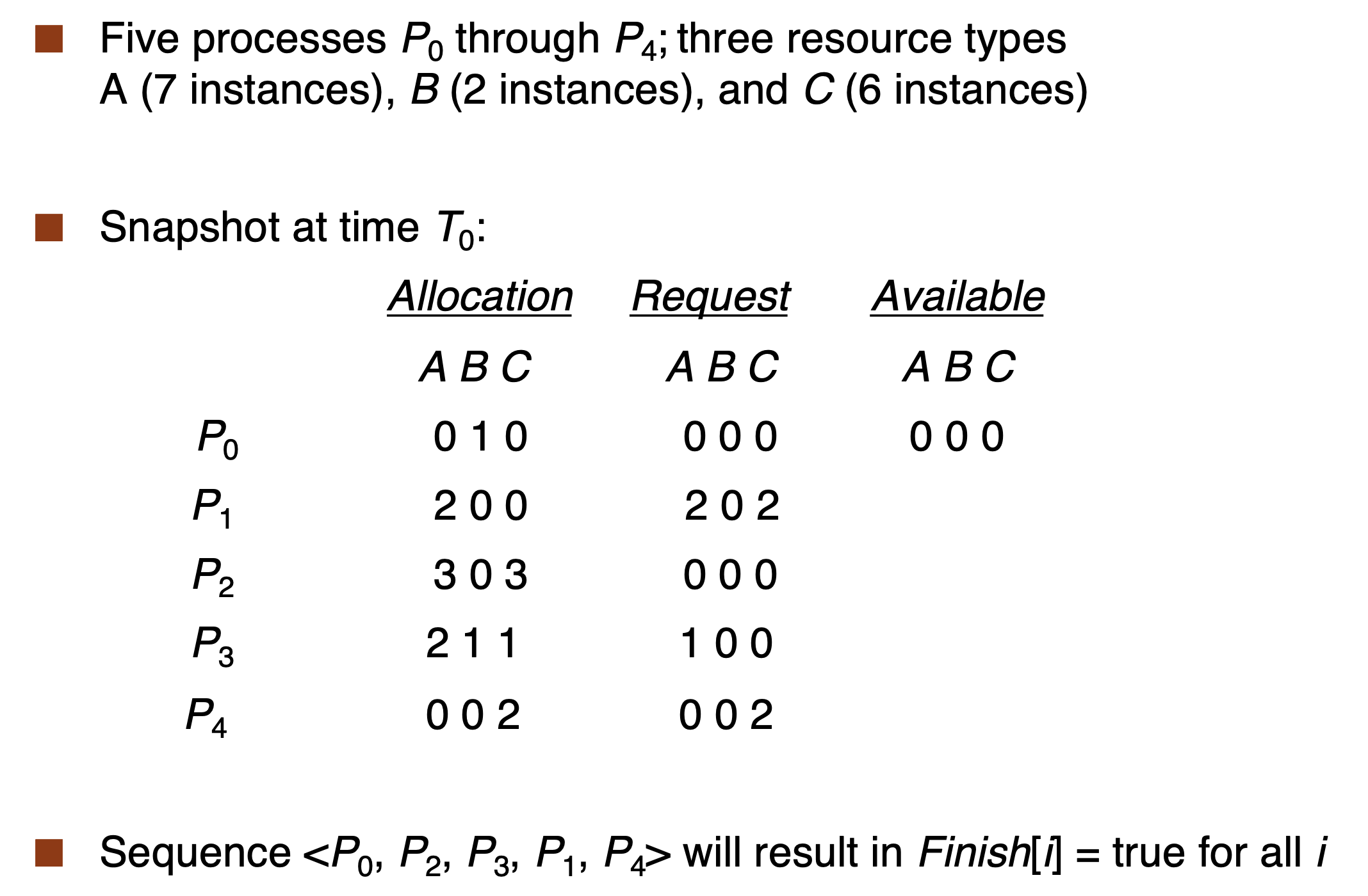 P0과 P2의 request 값이 (0,0,0) <= work(0,0,0)이므로 만족하기 때문에 P0을 true로 하고 P0이 점유하고 있던 (0,1,0)을 work에 추가한다. 이렇게 하다보면 모두 ture가 되는 시퀀스가 나오게 된다.