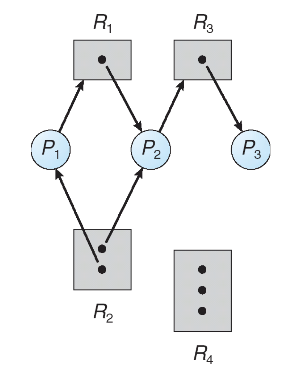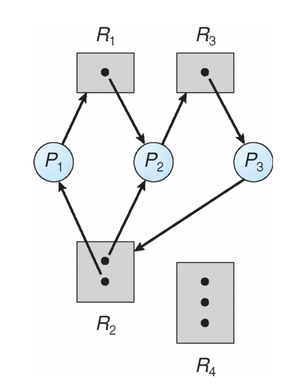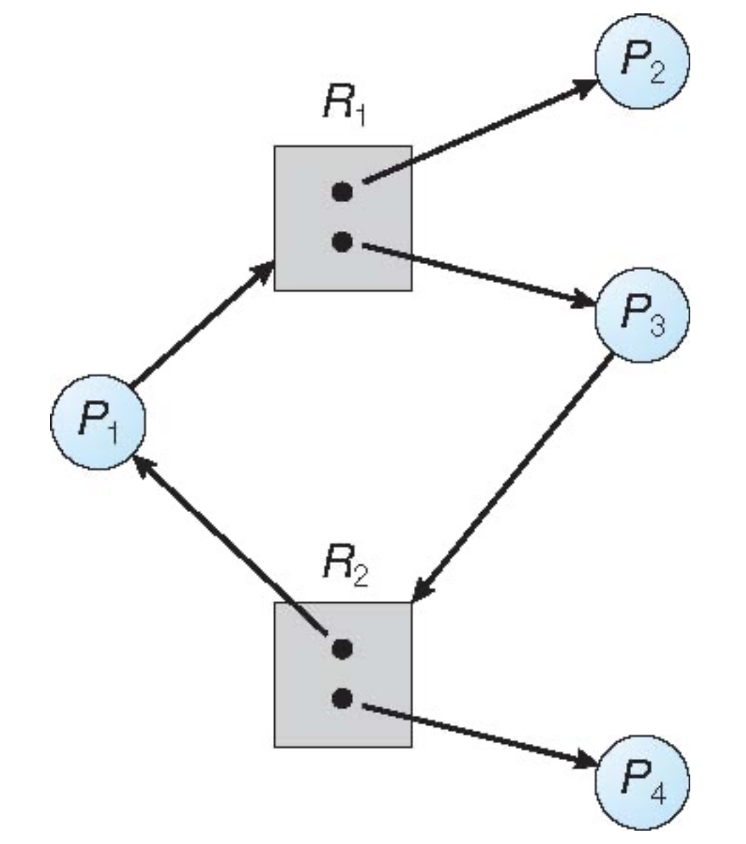 즉 사이클이 존재하는데, 자원 인스턴스가 한개면 데드락이 발생하지만, 2개 이상이라면 데드락의 "가능성"이 있는것이다.
