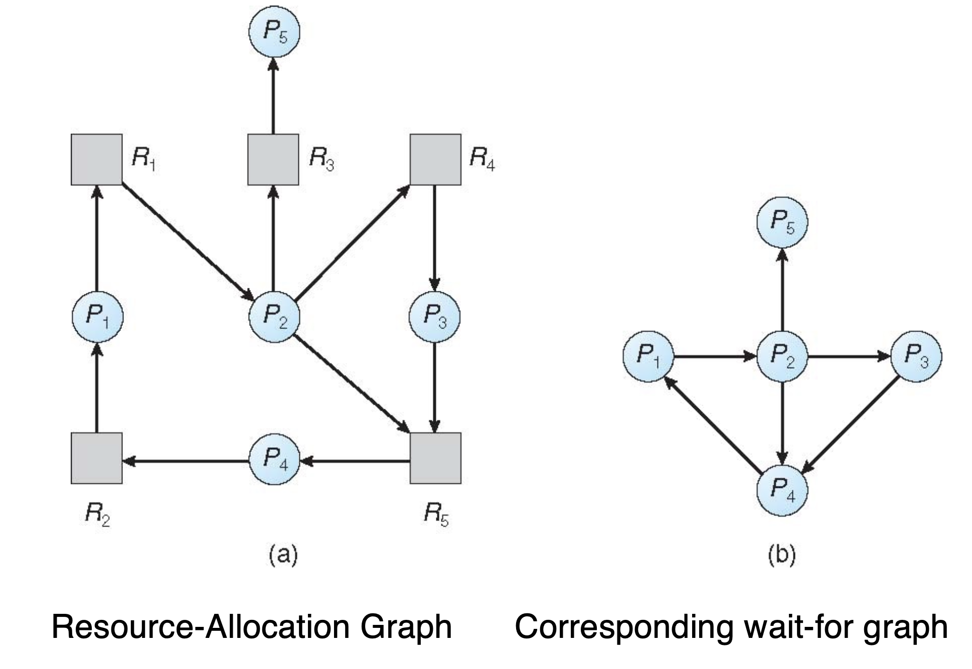 간선: Pi->Pj(Pi가 Pj가 점유한 자원을 기다린다)