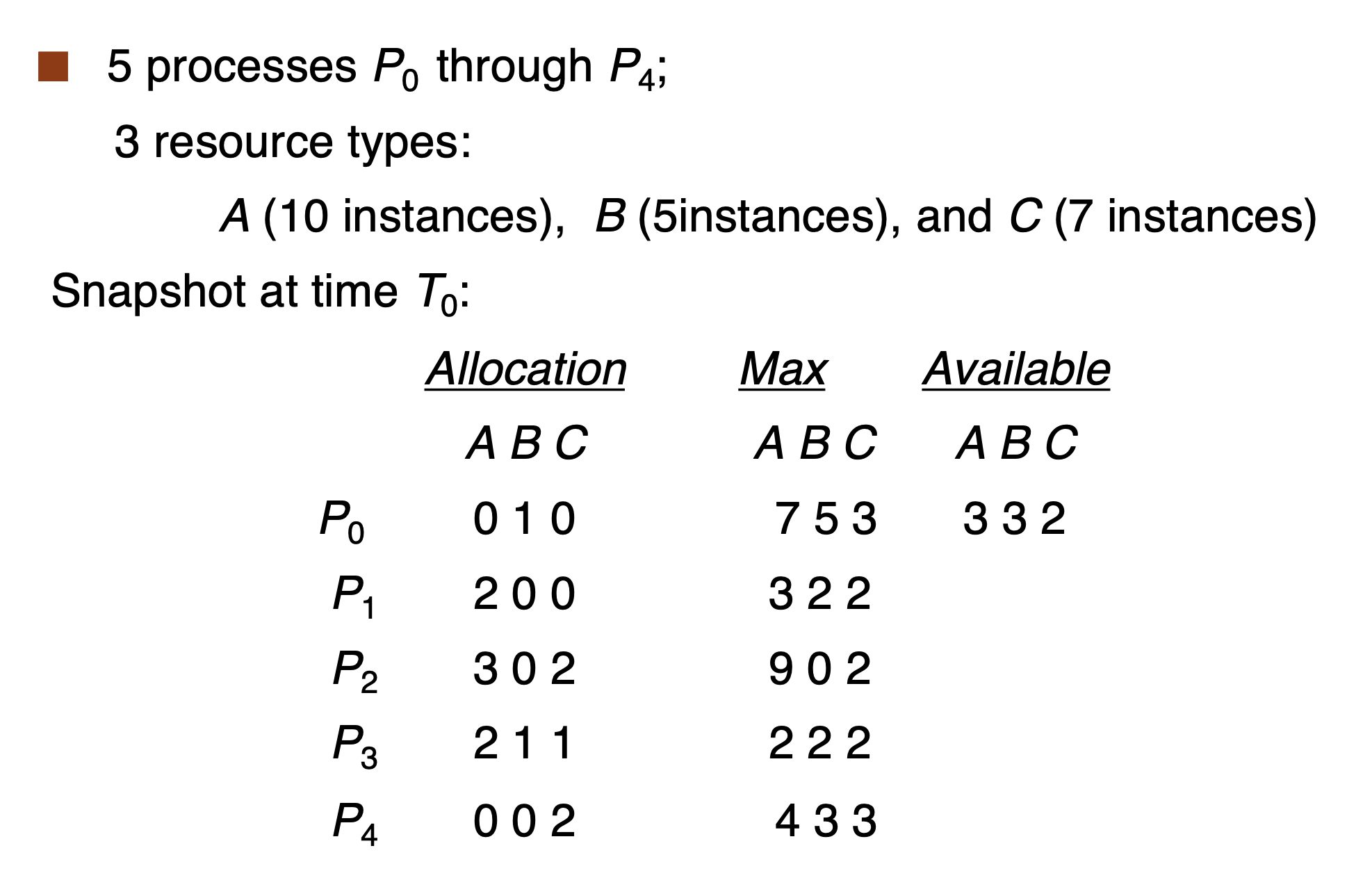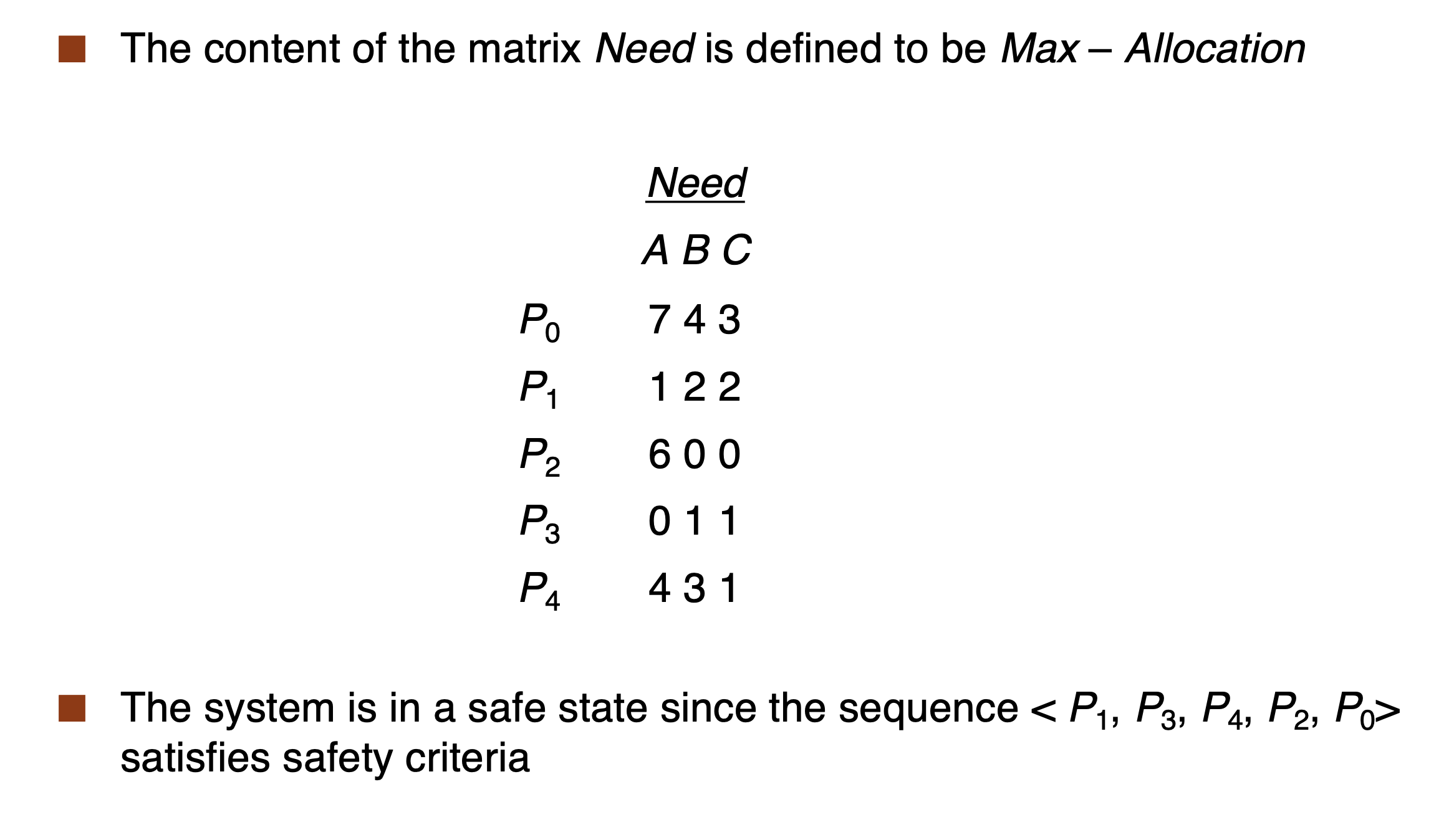 | Need | n x m 행렬 | 각 프로세스가 앞으로 추가로 필요한 자원 수 (max - allocation) |