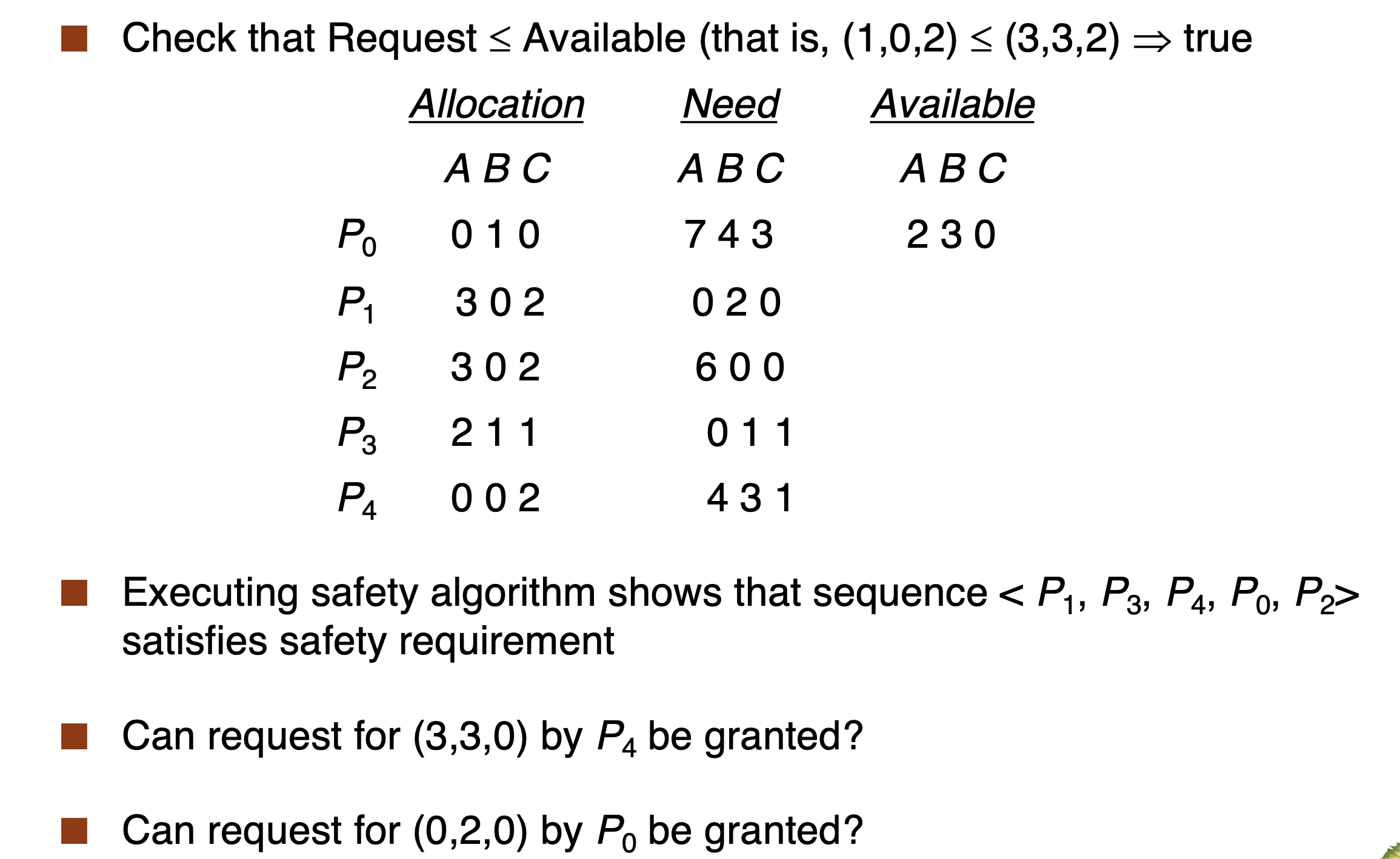 원래 Available이 (3,3,2) 였는데 새로 요청된 (1,0,2)를 사용하기 때문에 (2,3,0)이 새로운 Available이 된다.