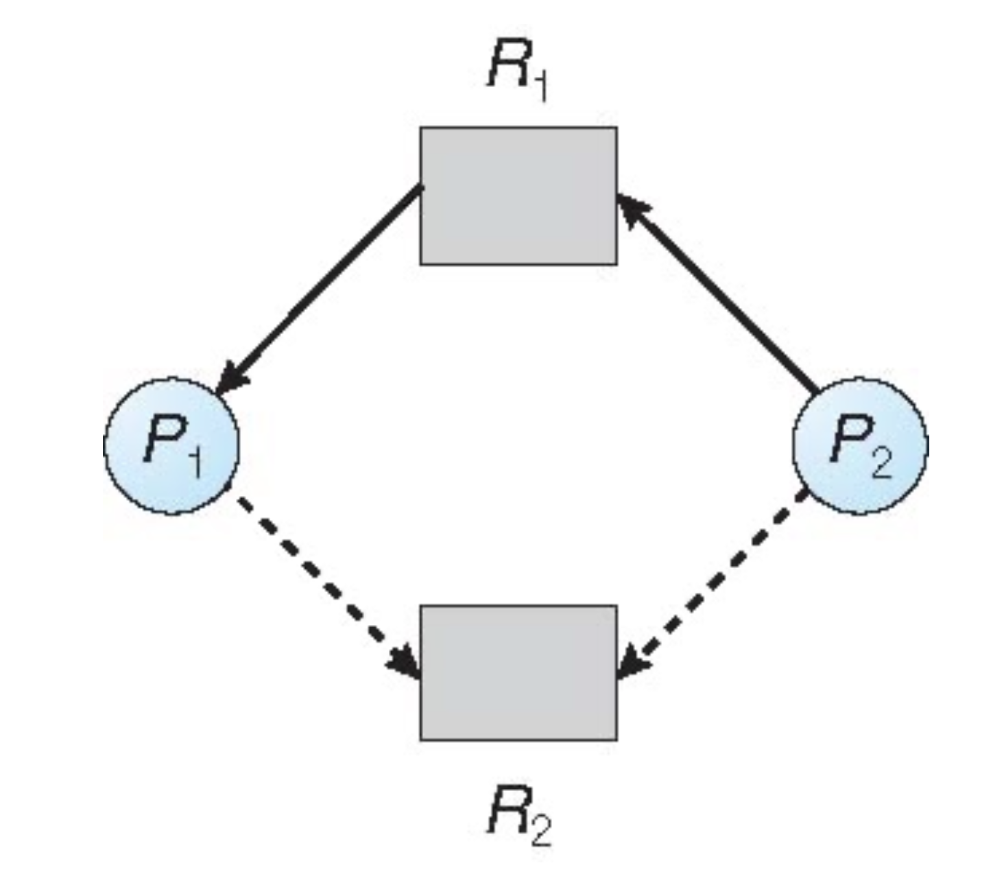 예시: 시스템 디스크 드라이브 2개, p1 과 p2가 각각 하나씩 보유중인데 서로가 상대방의 디스크를 요구하며 대기한다 -> 교착상태 발생.