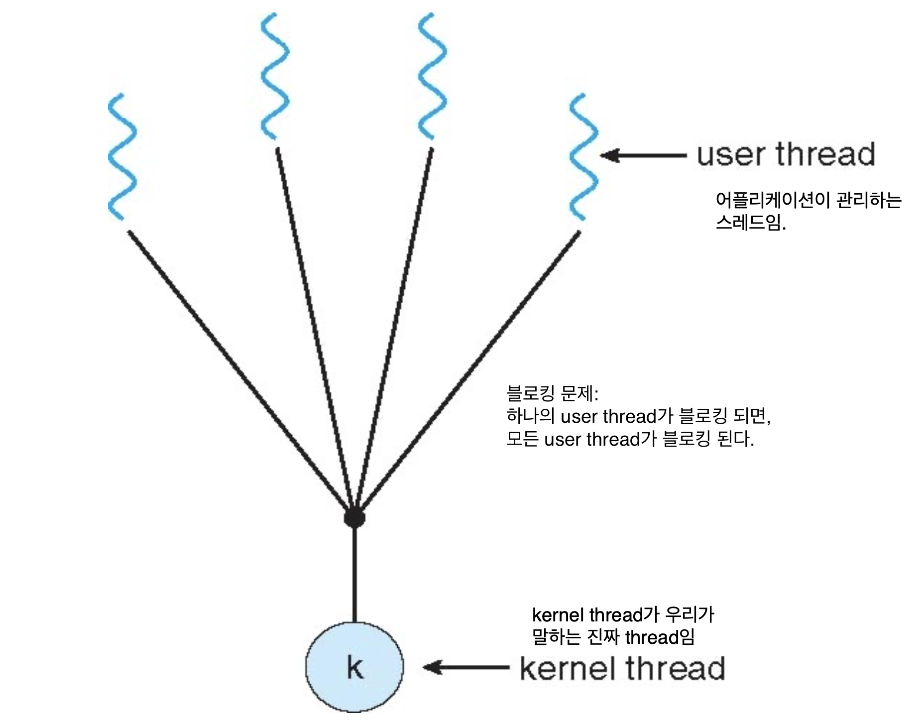 다수의 사용자 수준 스레드를 단일 커널 스레드에 매핑한다. 스레드 관리가 사용자 공간에서 이루어지기 때문에 경량화 된다.