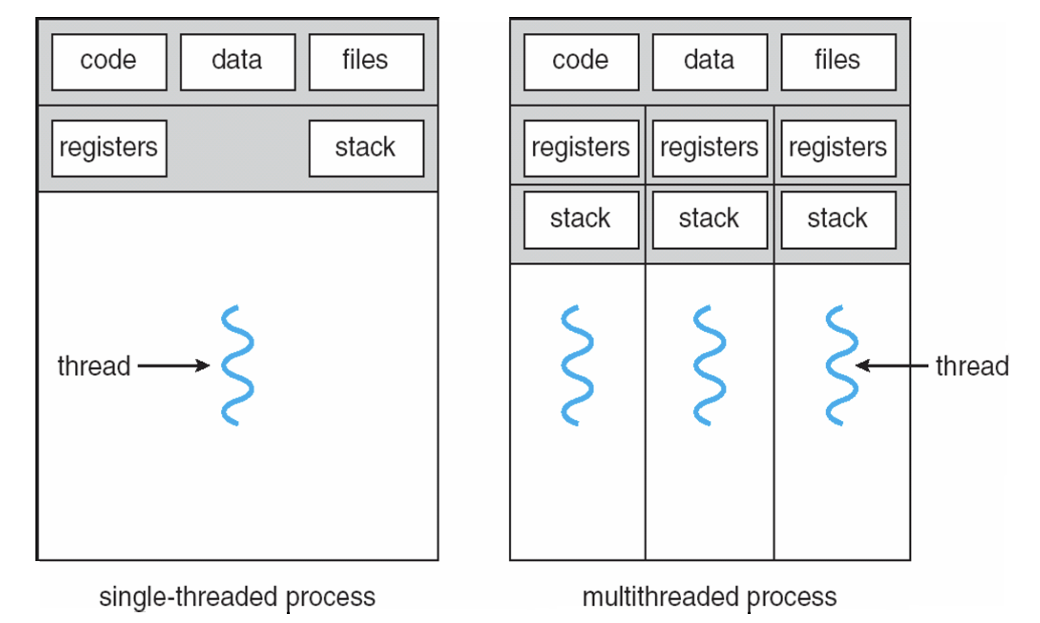 - 레지스터와 스택은 각 스레드 마다 독립적으로 갖는다.