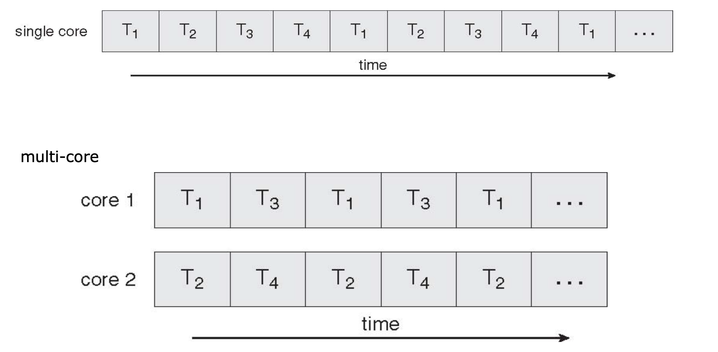 - single코어에서는 병렬처리가 보이게끔 context switching을 이용해 처리하지만,