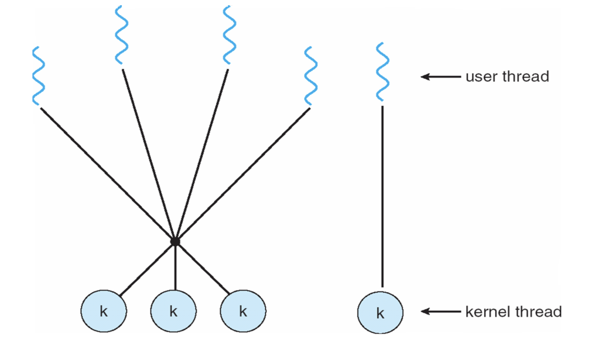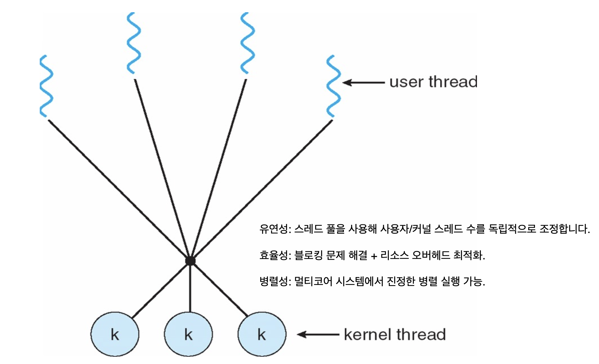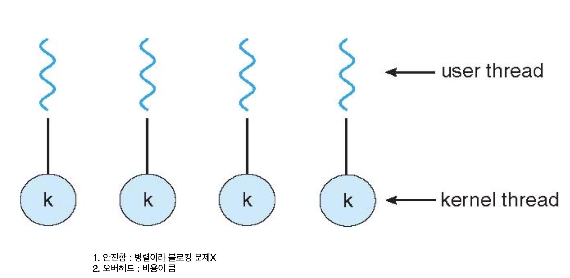 : 스레드 관리 및 스케줄링이 운영체제 커널에서 직접 이루어 진다.