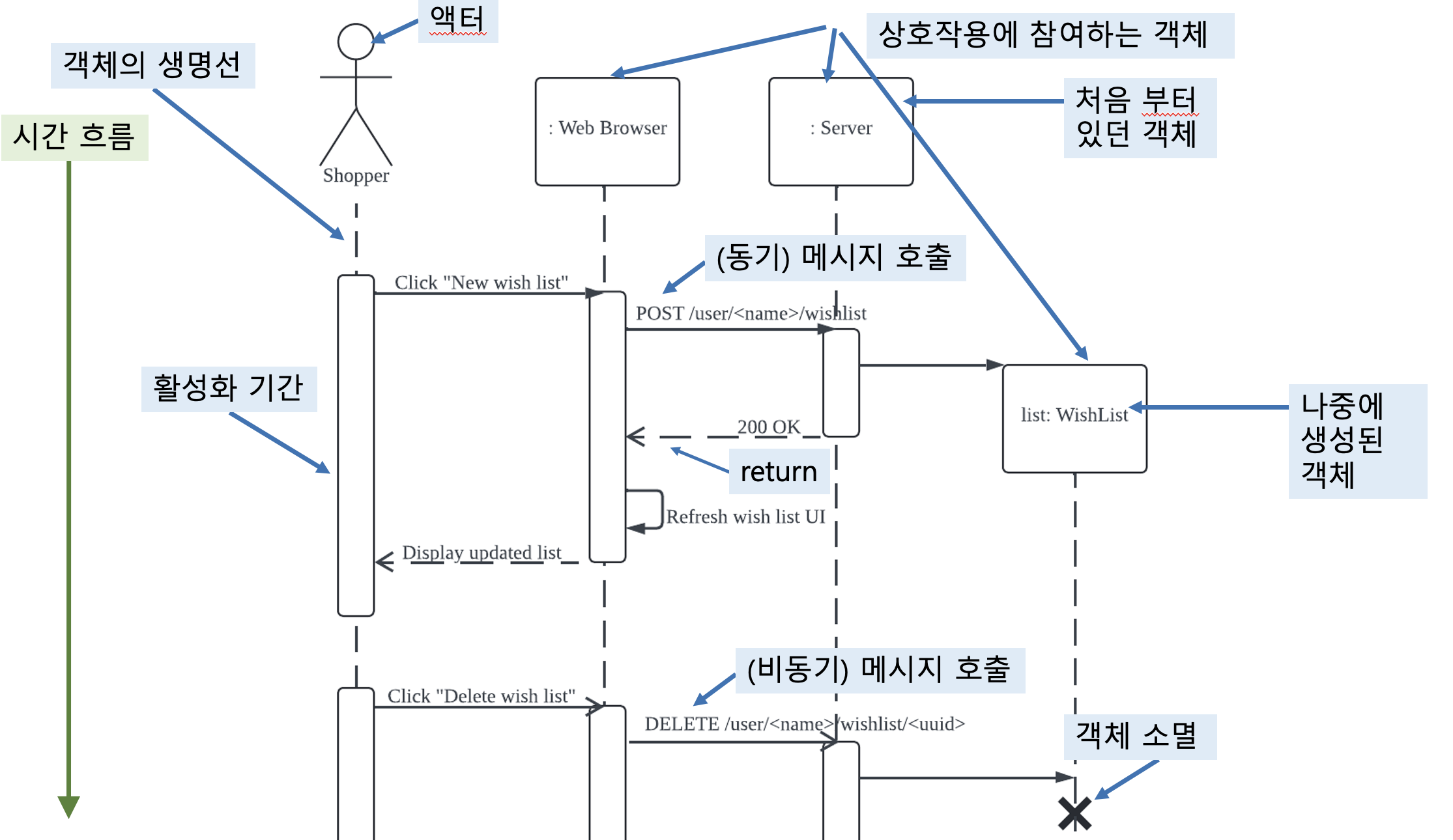 액터, 객체, 컴포넌트들의 상호 작용을 "시간 순서"대로 표현하기 위해서 사용됨.