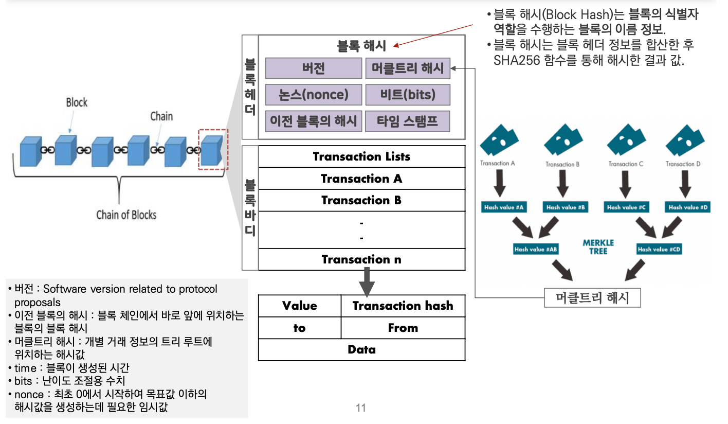 블록에 대한 정보와 메타데이터를 포함하고 있다. 블록체인의 연결성과 무결성을 보장하는 핵심 요소이다.