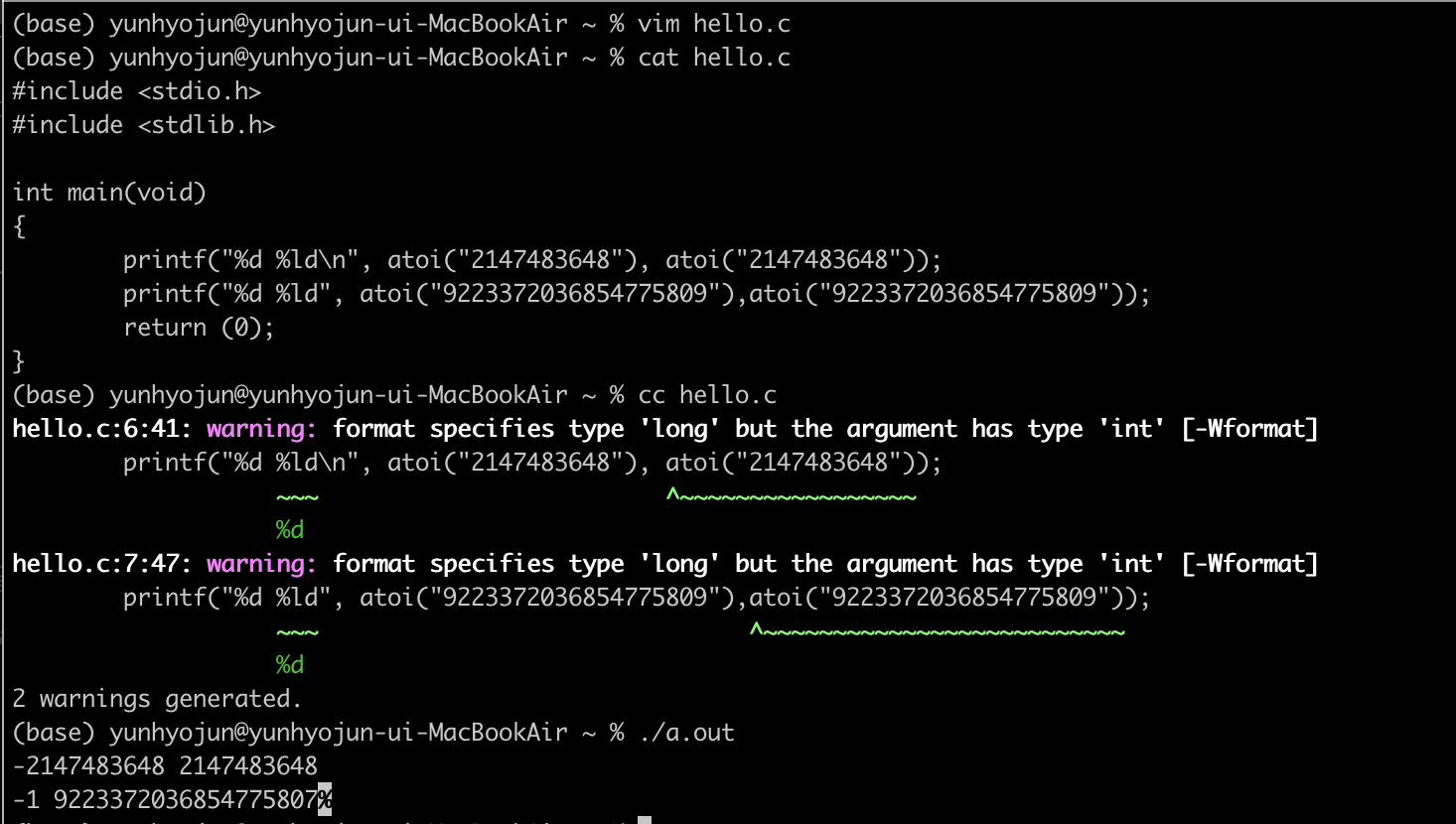 printf("%d %ld\n", atoi("2147483648"), atoi("2147483648"));