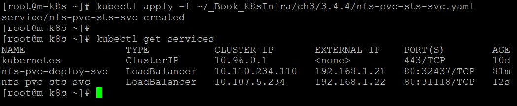 다음 경로를 적용해 스테이트 풀셋을 노출하기 위한 서비스를 생성하고, kubectl get service 명령으로 생성한 로드밸런서 서비스를 확인합니다.