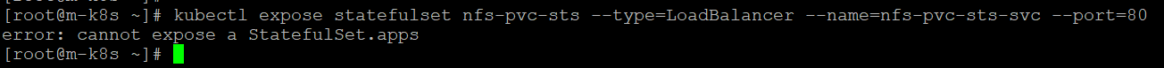 이는 expose 명령어 스테이풀셋을 지원하지 않기 때문입니다. 해결하려면 파일로 로드밸런서 서비스를 작성, 실행해야합니다.