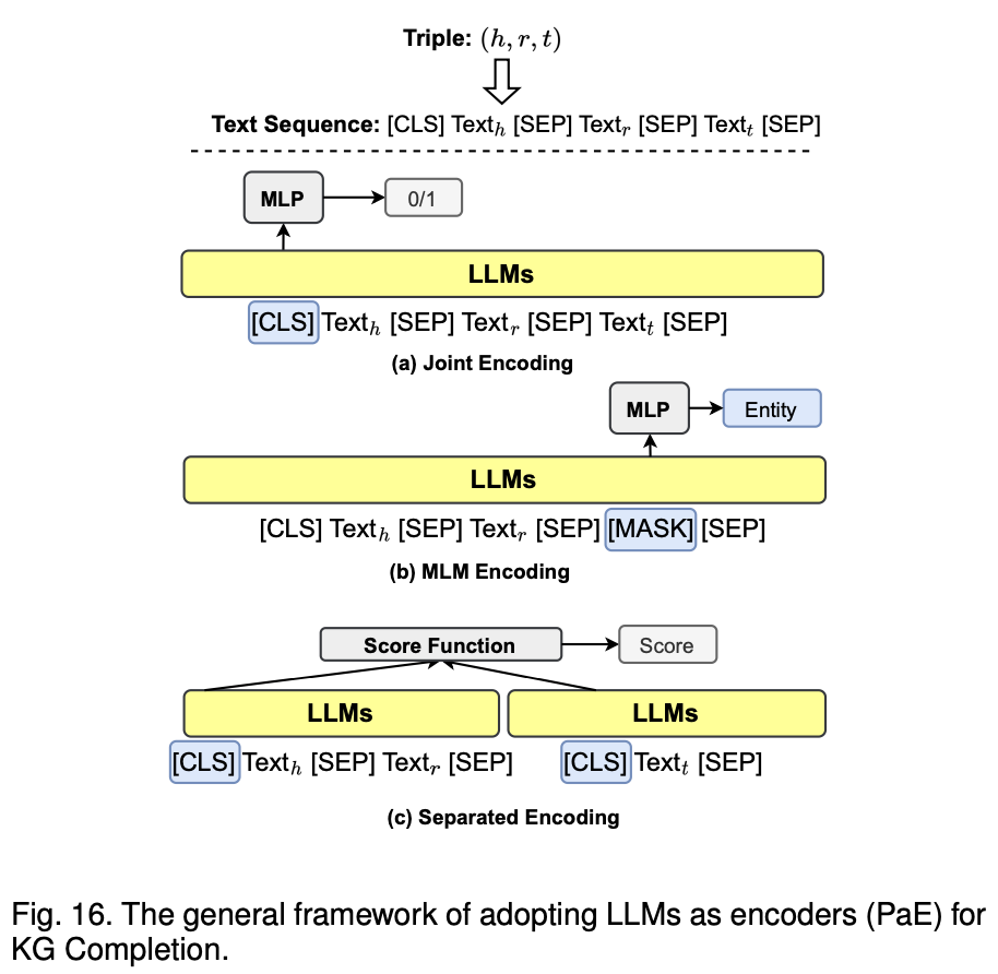 이 아키텍처의 핵심은 KG Completion을 위해 다양한 방식으로 트리플의 각 요소를 인코딩하는 방법을 설명, 트리플의 구성 요소를 어떻게 인코딩하고 예측하는지에 따라, Joint Encoding, MLM Encoding, Separated Encoding으로 나뉘며 각각의 방법이 상이한 방식으로 사실을 예측하거나 KG를 완성하는 데 기여