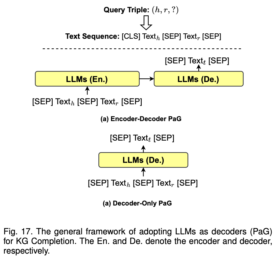 이 아키텍처는 Prompt-based PaG (Prediction as Generation) 방식으로 Knowledge Graph Completion (KGC)을 수행하는 구조임 즉, LLM에 프롬프트를 활용하여, head 엔티티와 관계가 주어졌을 때, tail 엔티티를 예측하는 방식으로 생각하면 됨