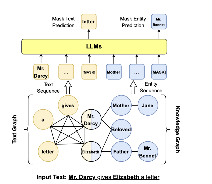 텍스트 마스킹과 엔티티 마스킹을 활용하여 LLM에 KG를 통합하는 방식 이를 통해, 텍스트와 지식 그래프 사이의 상호작용을 강화