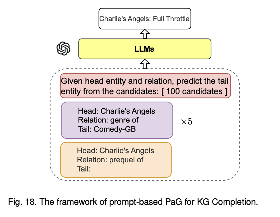 LLM은 여러 후보 tail 엔티티들 중에서 적절한 tail을 예측해야 하기에 'Charlie’s Angels'라는 영화의 장르(genre of)를 예측하는 경우가 프롬프트로 주어지면, LLM은 이에 적합한 장르 후보들을 제공받고 이 중에서 예측을 진행함