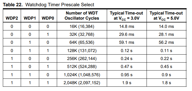 WDE비트가 Watch Dog Enable비트이고, WDP2~1비트의 조합으로 다음과 같이 주기를 설정할 수 있다.