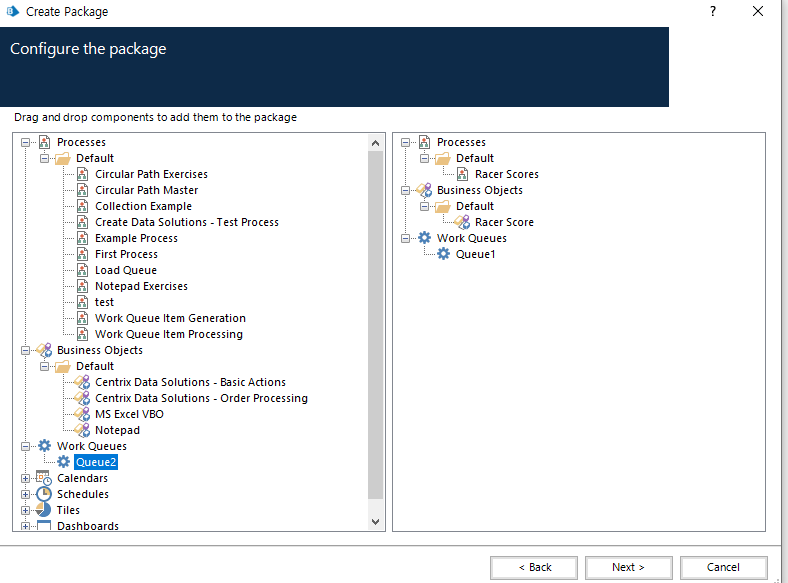 창의 왼쪽 영역에서 구성요소를 끌어서 오른쪽 영역에 놓아 패키지 구성