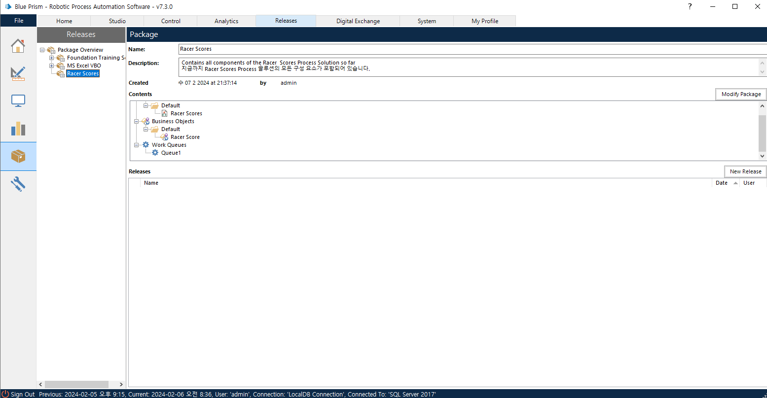 블루프리즘 솔루션의 개발 주기 중 다양한 단계에서 Release를 데이터베이스 간에 내보내고 가져온다.