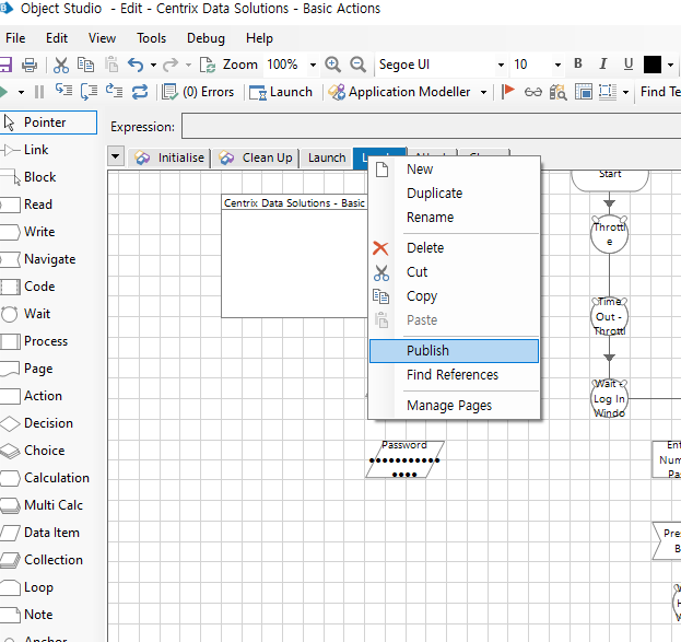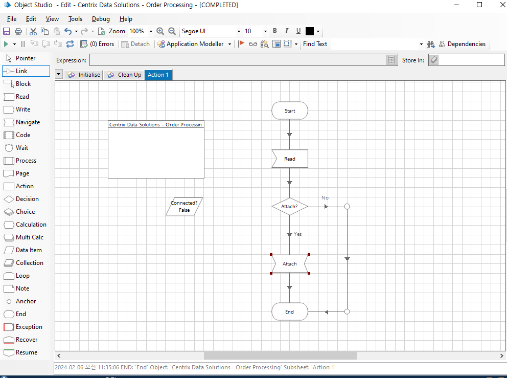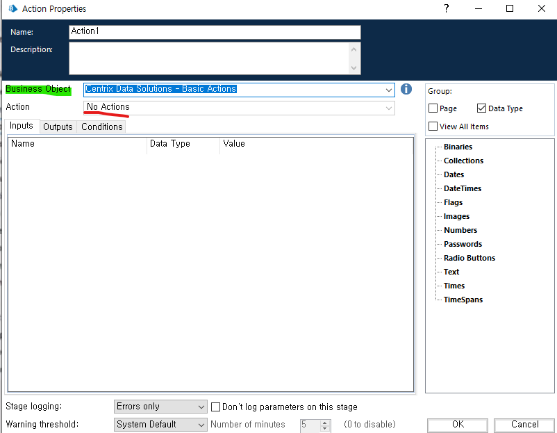 Object Studio 에서 새로운 프로세스를 하나 생성한 후 Action1 Page 클릭 >