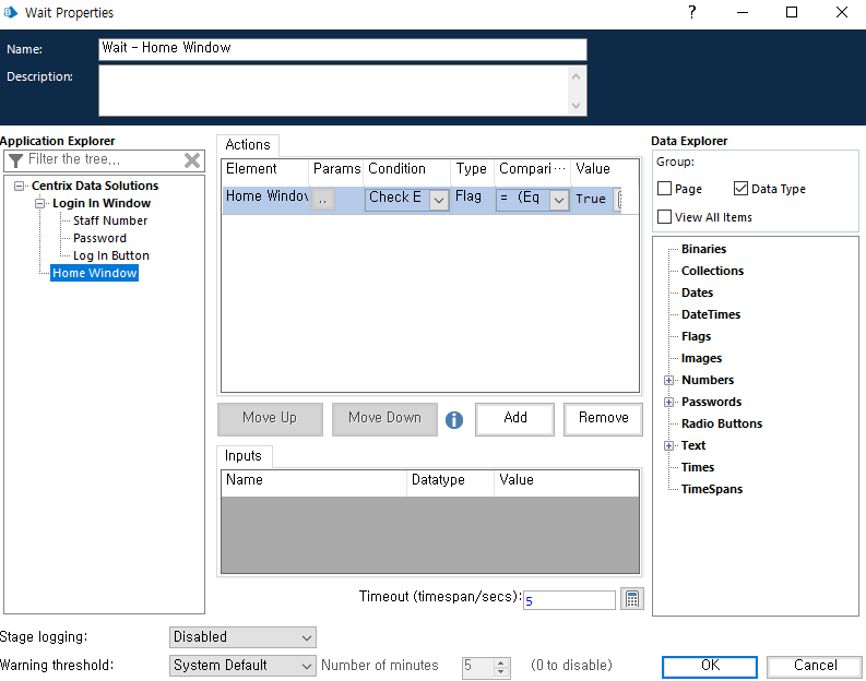 이는 비즈니스 객체의 Initaialise 페이지에 저장되고, 대기 스테이지 속성의 Timeout 필드에 적용된다.