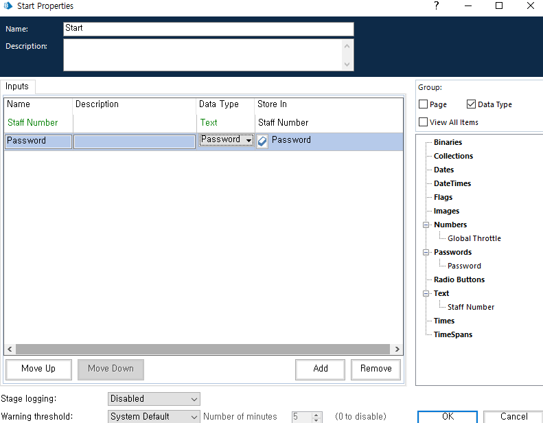 첫번째 이름은 Staff Number이고 ,텍스트 데이터 유형이며 , 초기 값은 bp