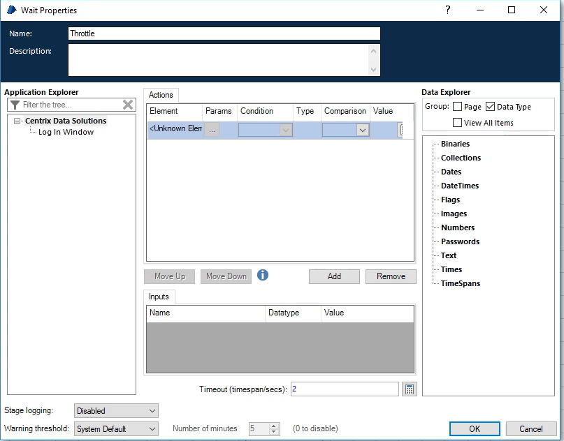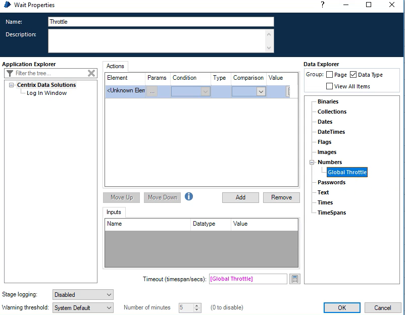대기 스테이지 속성 창에서 Timeout 값을 전역 스로틀 데이터 항목으로 바꿔준다.