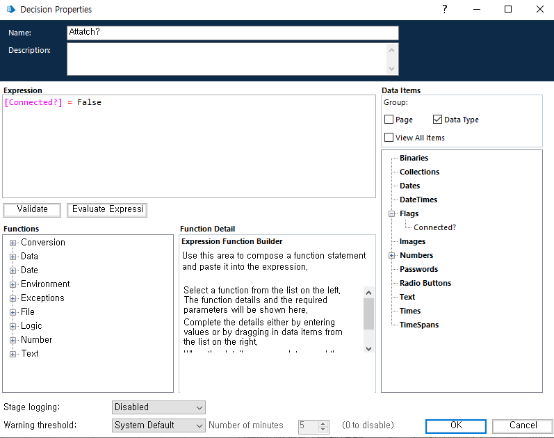 데이터 항목의 값을 확인 할 Decision Stage 추가