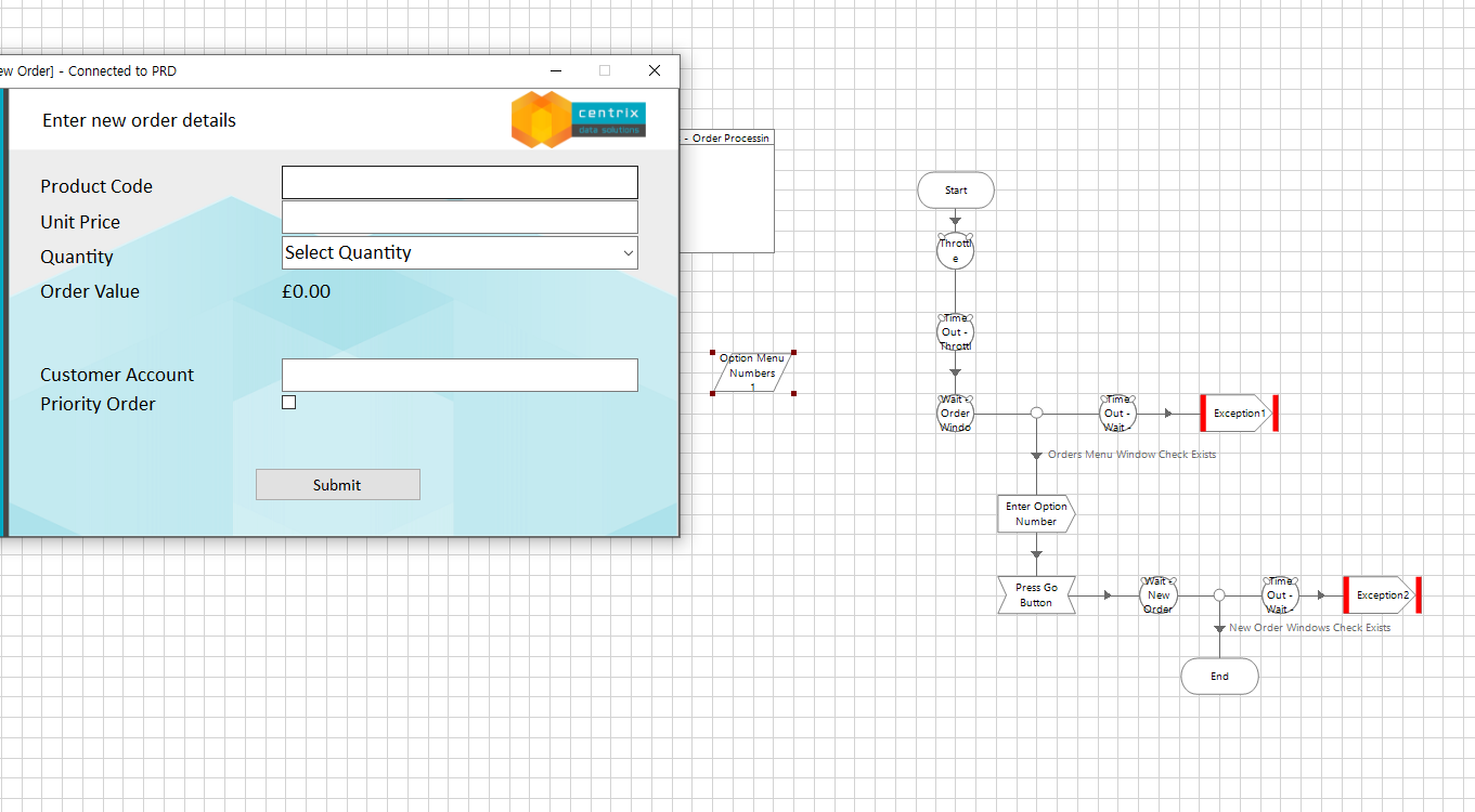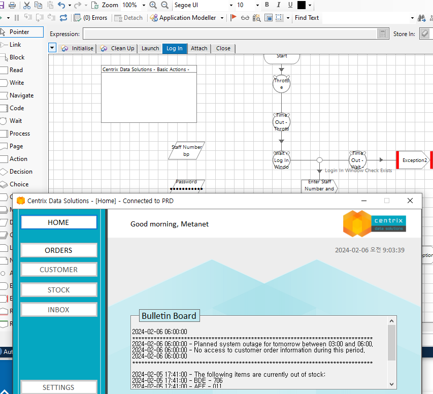스로틀(Wait Stage) 생성 > 주문 메뉴가 표시되는지 확인하기 위한 Wait Stage 생성 > 유효한 메뉴 옵션 중 하나를 입력하기 위한 Write Stage 생성 > Go 버튼을 클릭하기 위한 Navigate Stage 생성 > 새 창을 확인하기 위한 두번째 Wait Stage 생성 (새 주문 창 감시) > 데이터 항목은 Write Stage 옵션 메뉴 값을 제공 실제로는 이값을 호출 프로세스에서 제공해야한다. > 올바르게 작동한다면 데이터 항목을 제거하고 액션 페이지에 대한 입력 매개변수를 설정해야 한다.