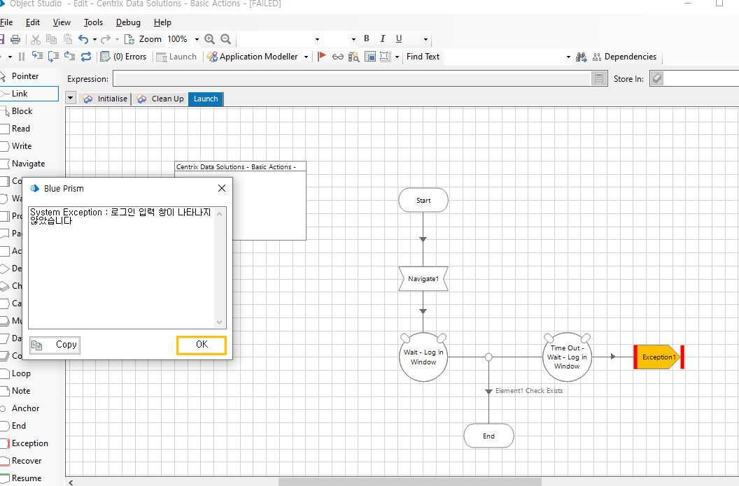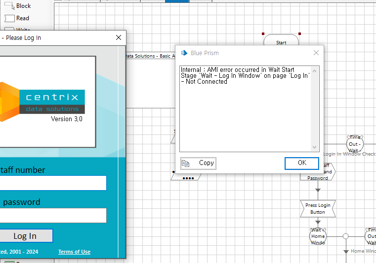 오류내용은 BluePrism이 응용 프로그램에 연결되지 않아서 작업을 수행할 수 없다고 알려준다.