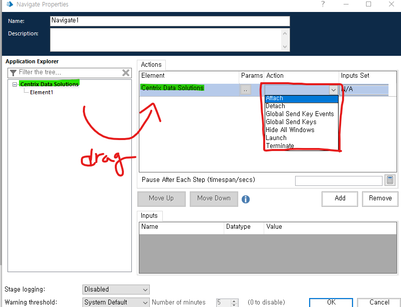 요소 목록에서 로그인 창 요소를 Actions 영역의 요소 열로 끌어오기.