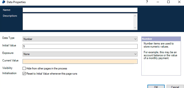 초기 값은 5로 설정하고 가시성 상자를 선택 취소 한 후 이름 입력.