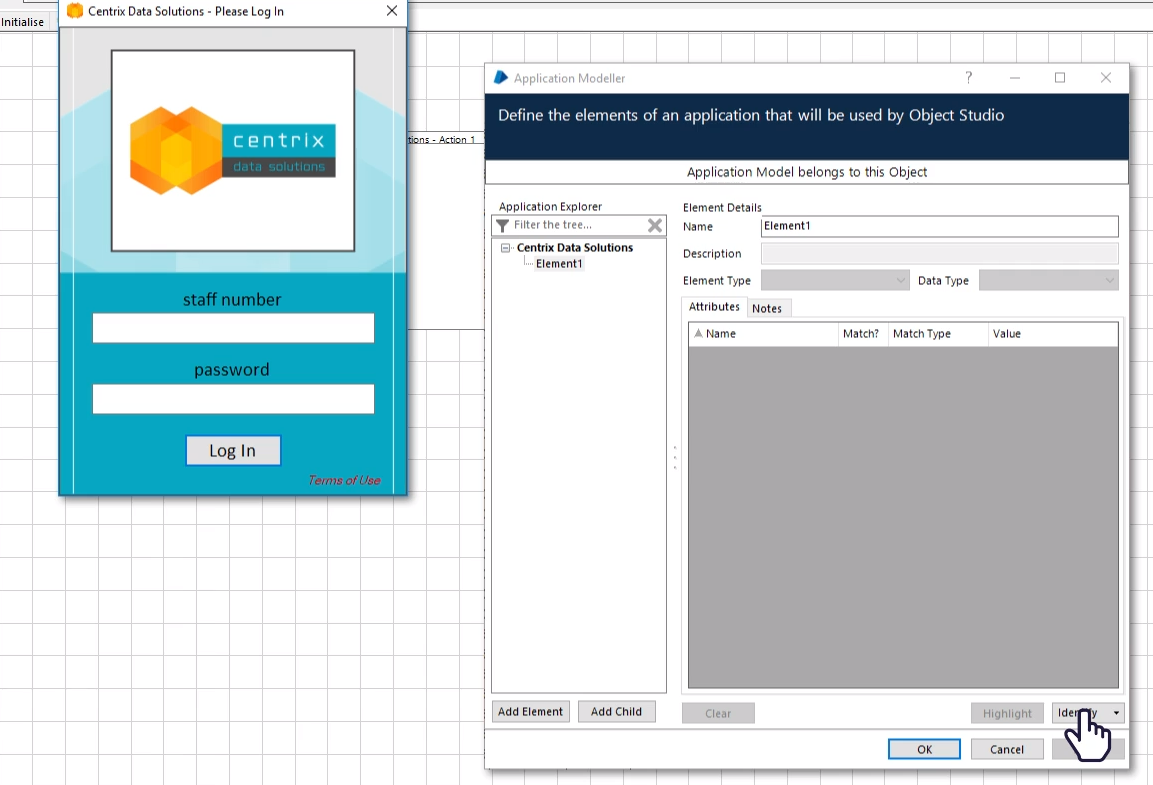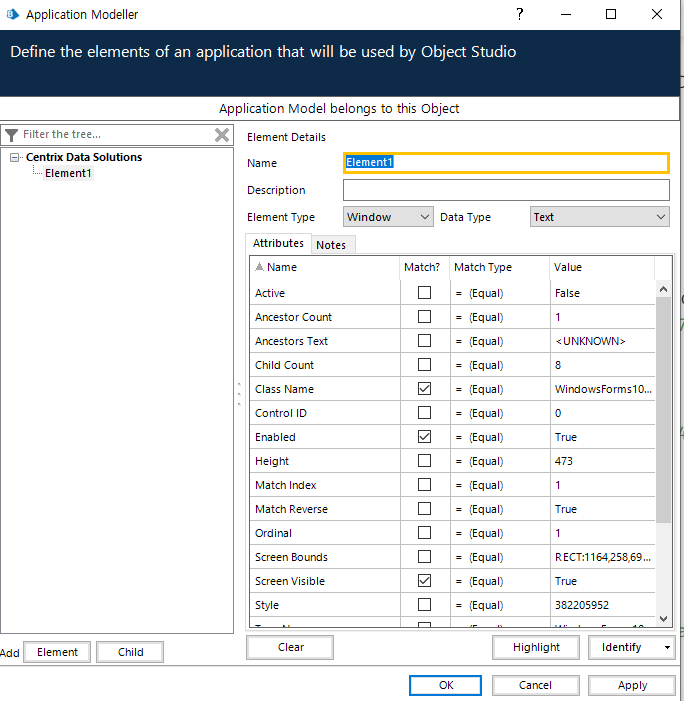 요소 트리 목록에서 Element1 을 선택 > identify 버튼을 누르면 spymode로 진입한다.