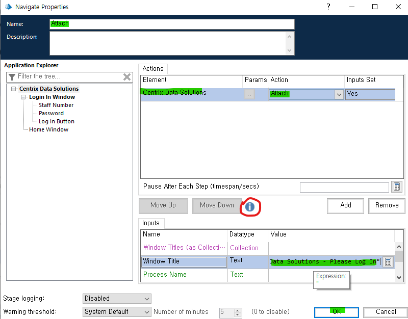 step 2.) 새 액션 페이지를 생성 후 탐색 스테이지를 만들어서 열려 있는 응용 프로그램 창에 접속 > 창 제목 속성을 사용하여 응용 프로그램의 로그인 창에 접속