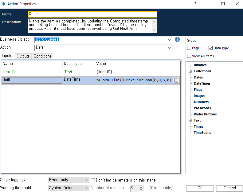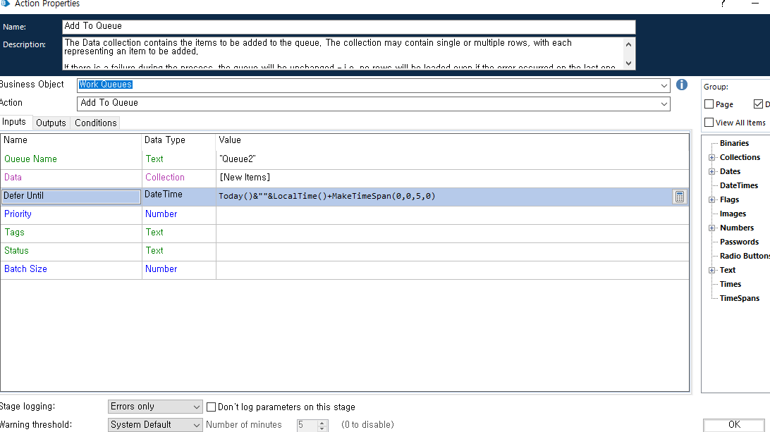 Step1.) Add To Queue 액션을 이용 Defer Until 매개 변수 설정 , 대기열에 추가된 항목이 지정된 날짜 및 시간까지 프로세스에 Release 되지 않도로 한다.