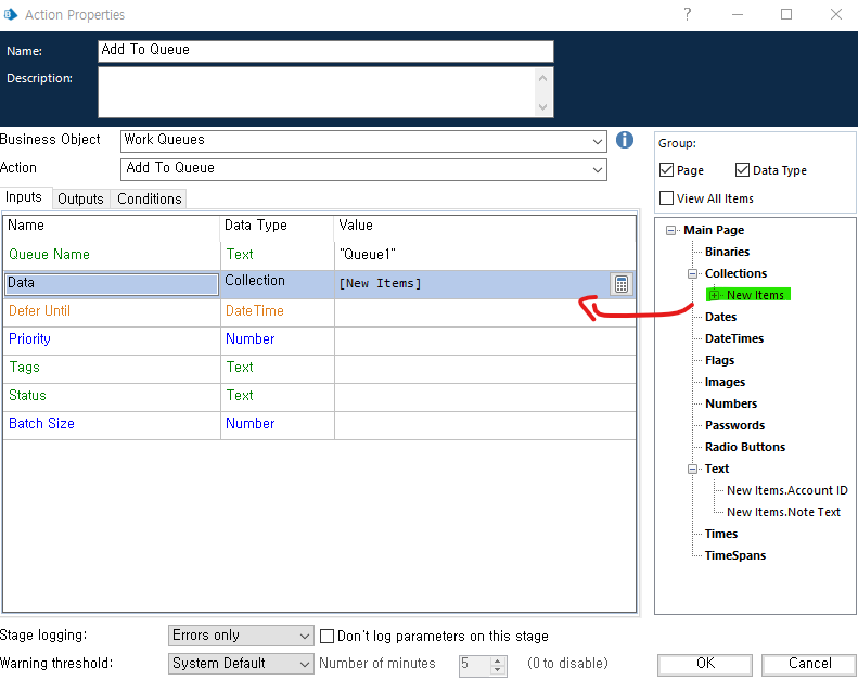 step1.) Collection Stage 행을 초기 값으로 채우고 액션을 사용하여 컬렉션의 각 행을 작업 대기열에 각각의 작업 대기열 항목으로 입력.